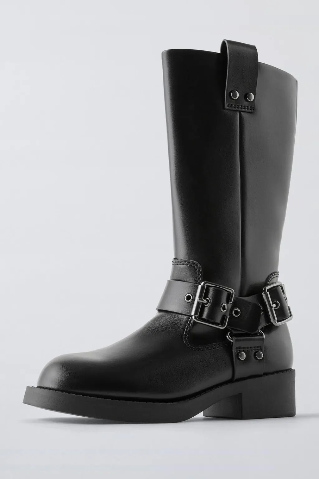 Bota alta con detalle hebillas en el corte. Cierre mediante hebilla lateral. Tirador lateral para facilitar el calce. Plantilla flexible. Suela de goma.