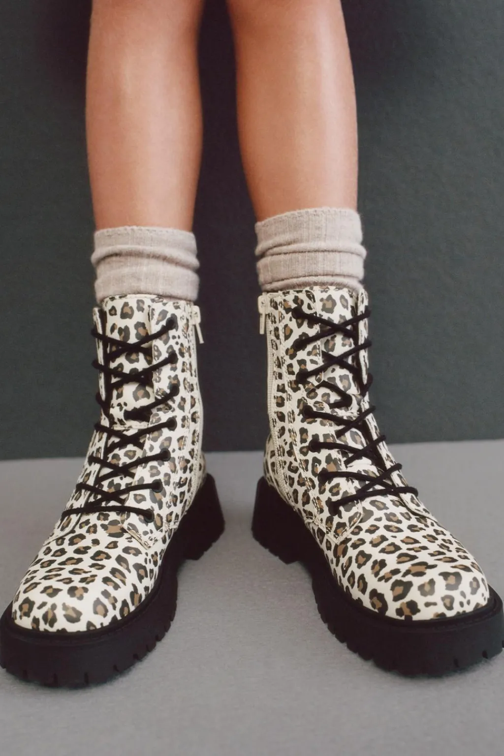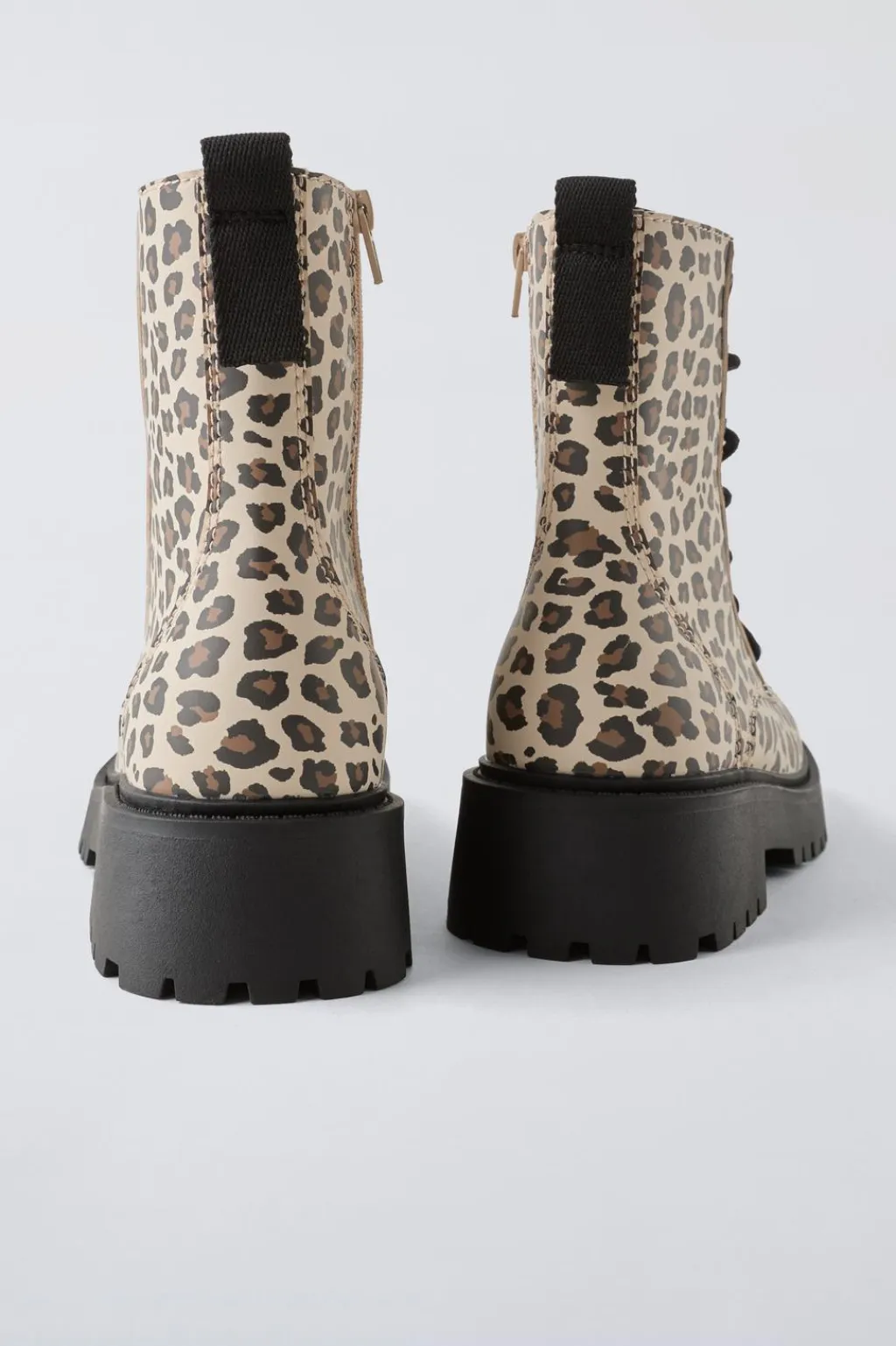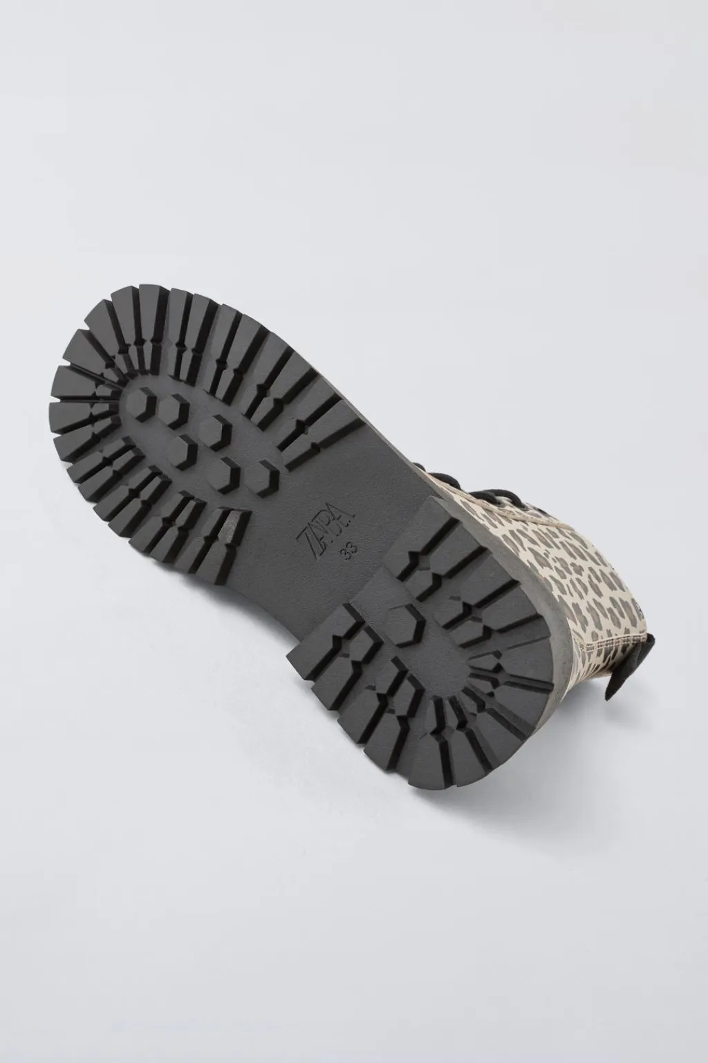 Botín con detalle animal print con cordones en su frontal. Cierre mediante cremallera lateral. Tirador trasero para facilitar el calce. Plantilla flexible. Suela de goma dentada estilo track en contraste de color.
