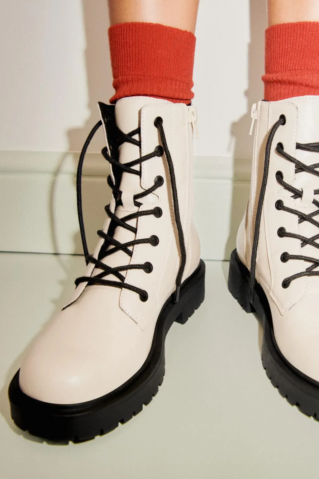 Botín con detalle cordones en su frontal. Cierre mediante cremallera. Tirador trasero para facilitar el calce. Plantilla flexible. Suela de goma dentada estilo track en contraste de color.
