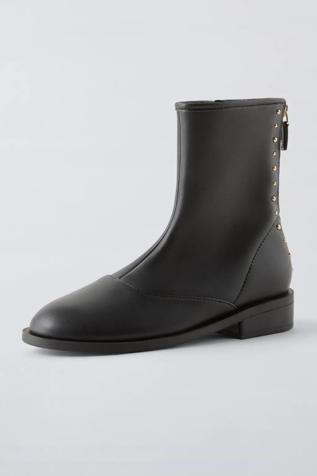 Botín con detalle tachas y cremallera en parte trasera. Cierre mediante cremallera lateral. Suela de goma.