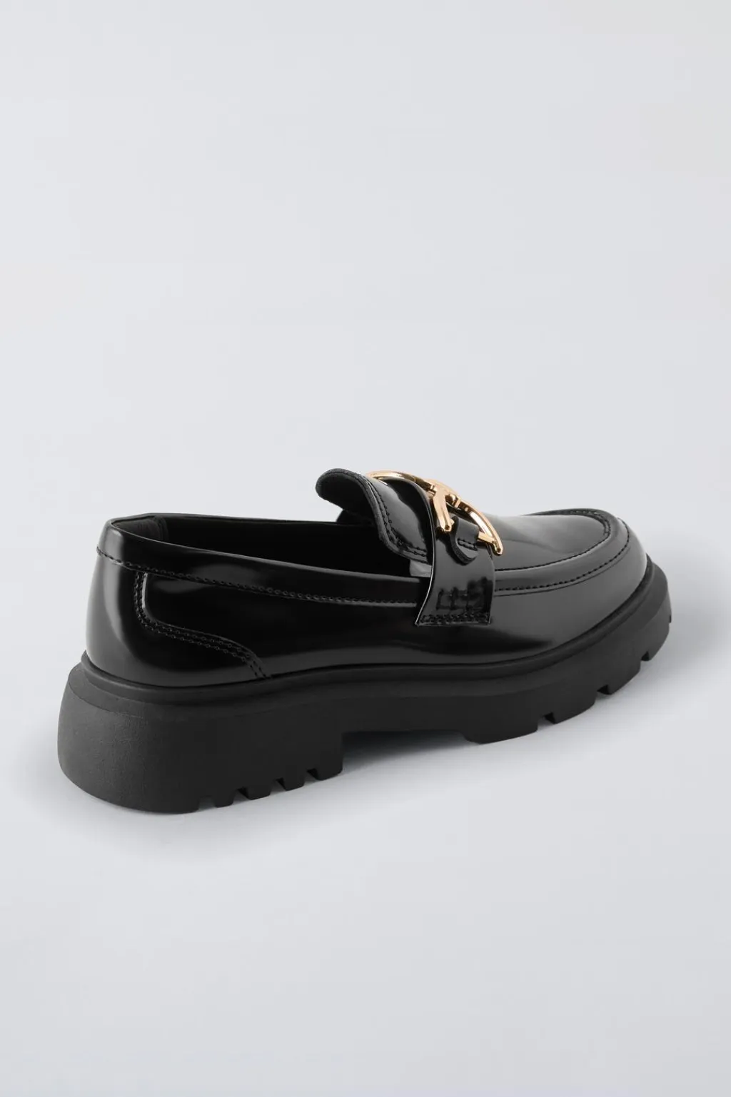 Zapato tipo mocasín acharolado. Detalle cadena en el empeine y ribeteado en el corte. Plantilla flexible. Suela de goma en volumen estilo track.