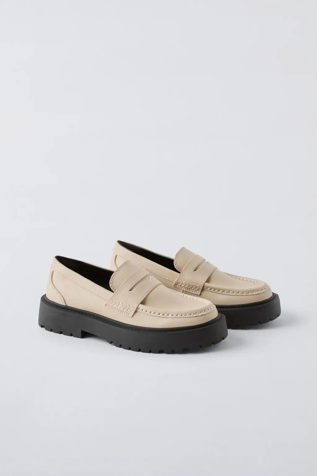 Zapato tipo mocasín con detalle antifaz en el empeine y ribeteado en el corte. Plantilla flexible. Suela de goma en volumen estilo track en contraste de color.