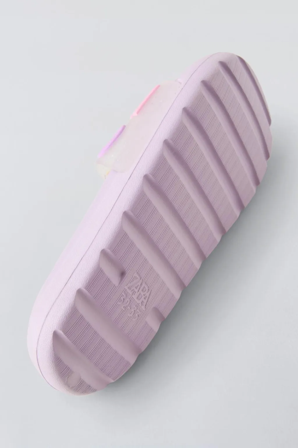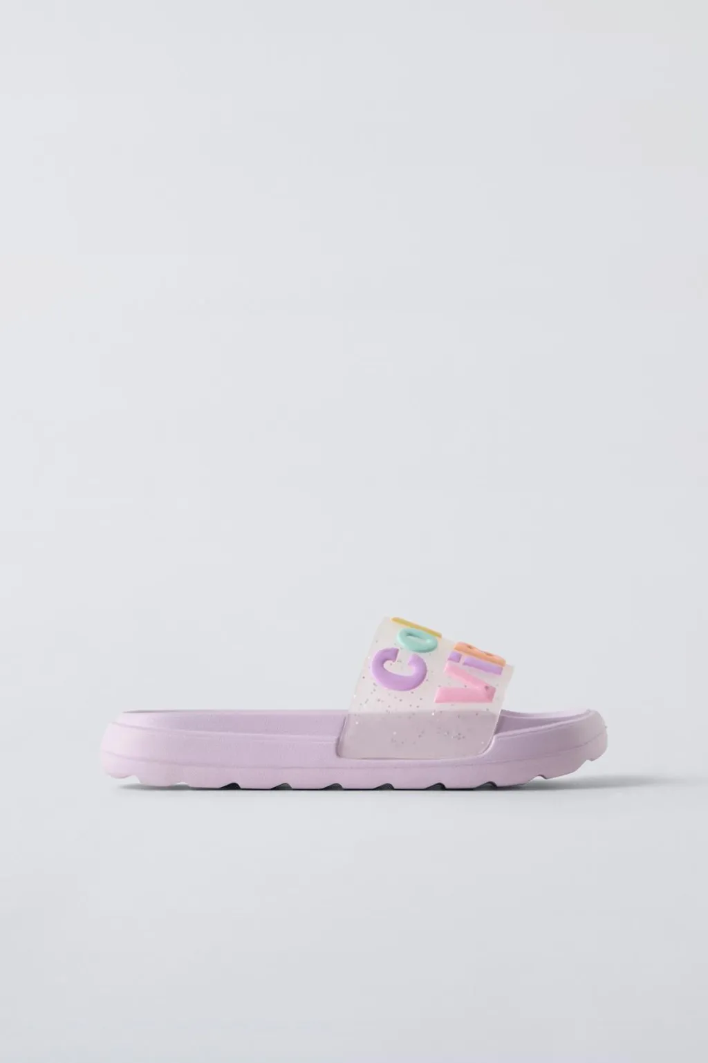 Sandalia de baño tipo pala con detalle texto y brillos. Tira ancha en el empeine. Suela de goma.