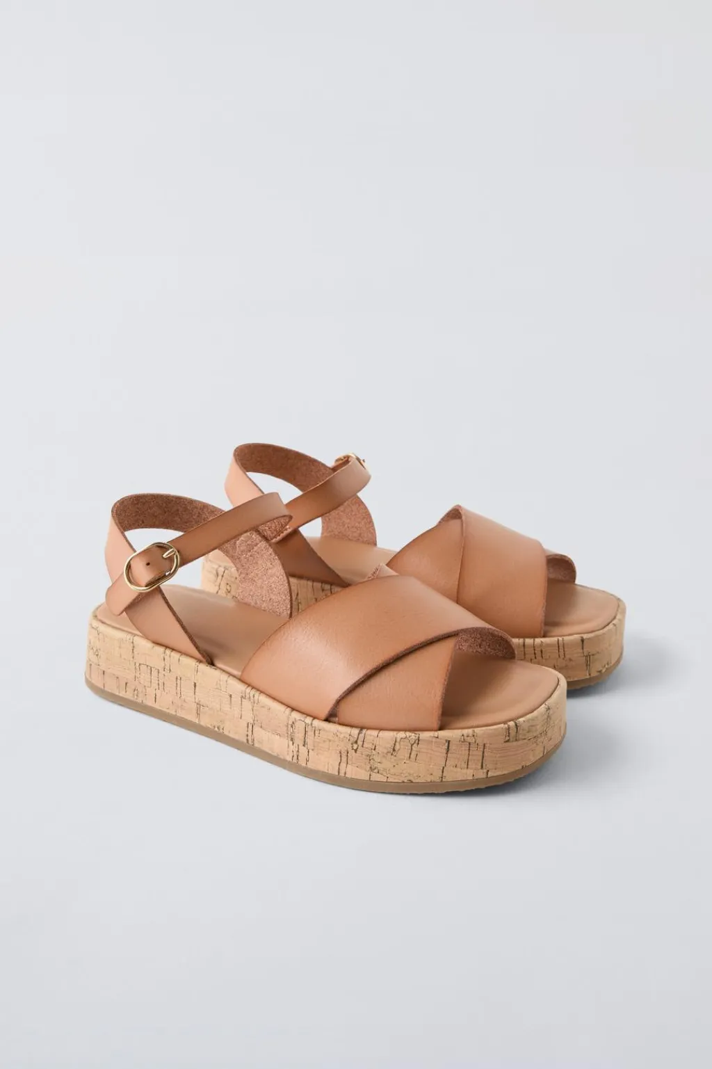 Sandalia cruzada. Cierre mediante hebilla lateral. Suela en plataforma de goma efecto corcho.