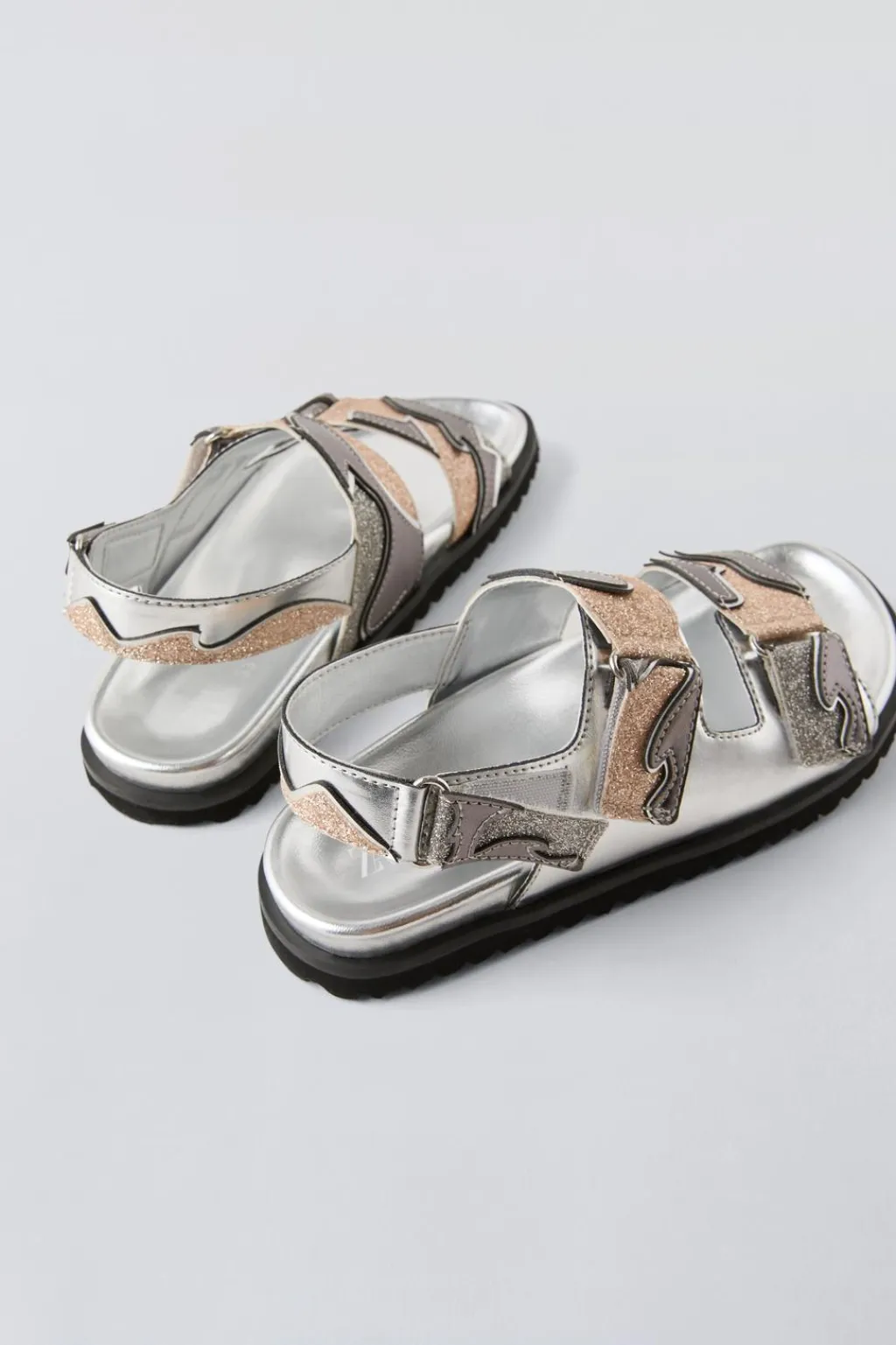 Sandalia metalizada con detalle glitter. Cierre mediante tira adherente trasera. Suela de goma dentada.
