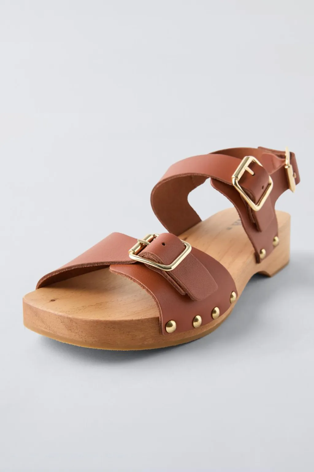 Sandalia 100% piel vacuno con detalle hebillas y tachas en el corte. Cierre mediante hebilla trasera. Plantilla 100% madera. Suela de goma.