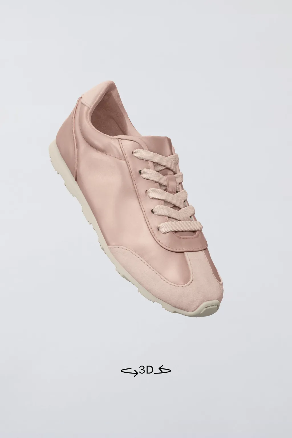 Zapatilla deportiva acabado en satén. Cierre mediante cordones ajustables. Plantilla flexible. Suela de goma en contraste de color.