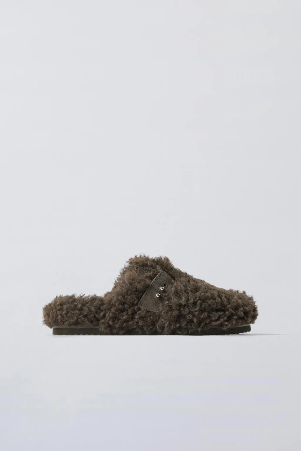 Zueco con efecto borreguillo y detalle hebilla. Suela de goma.