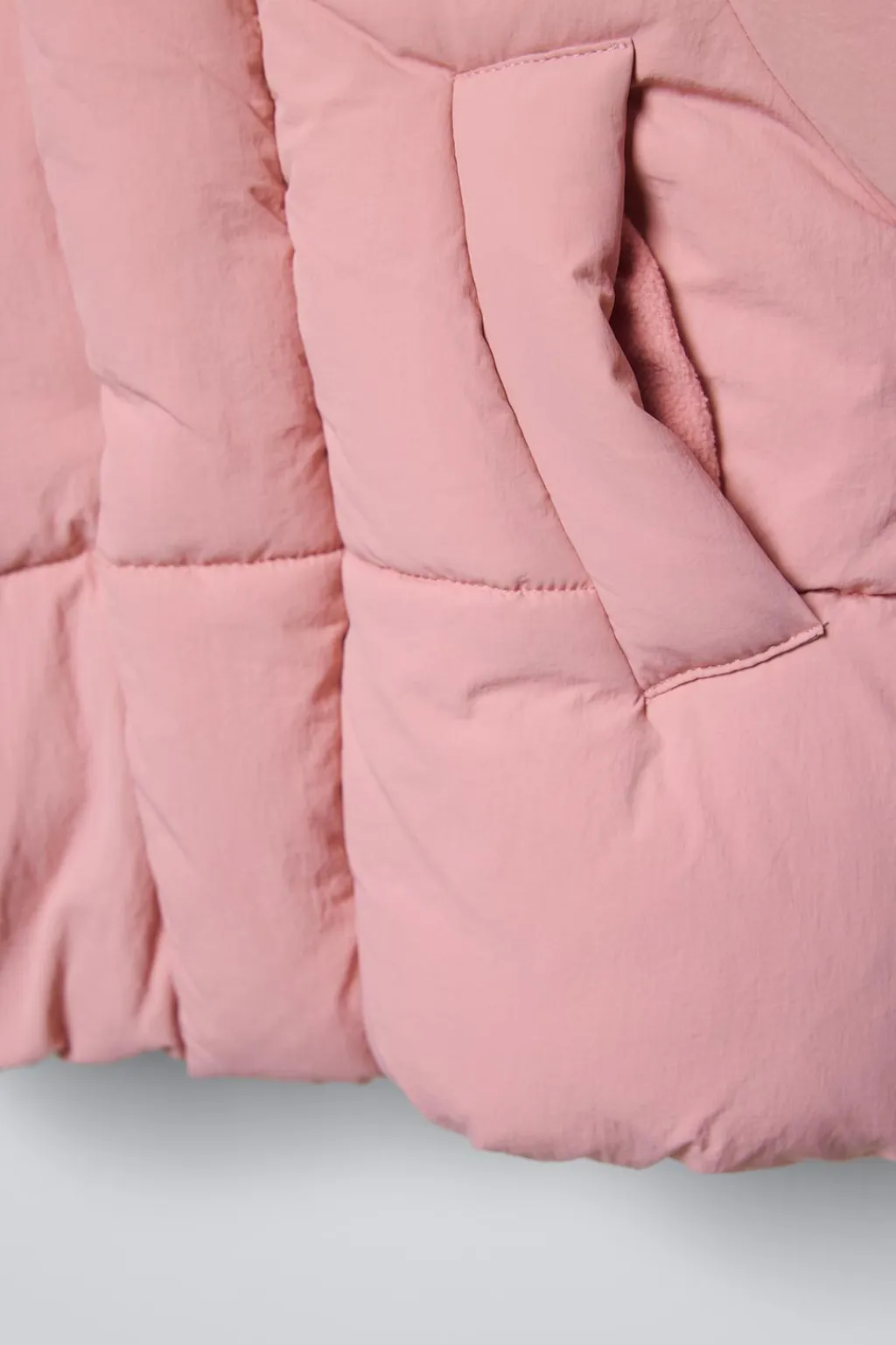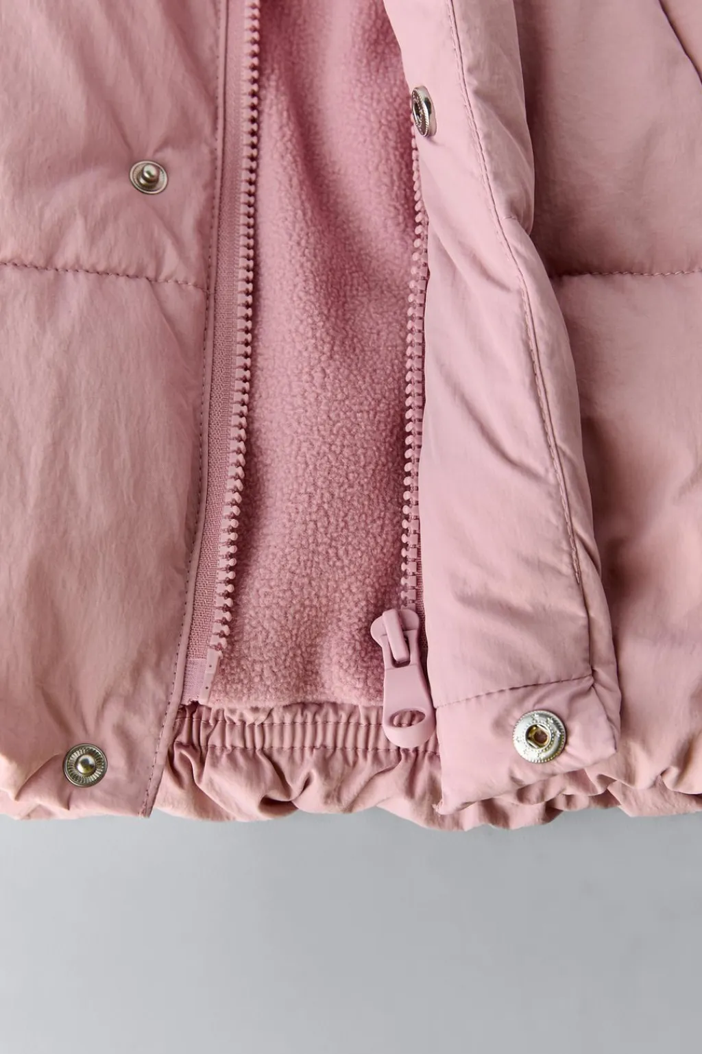 Cazadora con capucha, cuello subido y manga larga acabada en puño interior. Cierre cremallera frontal oculta por solapa con cierre botones presión. Bolsillos delanteros con detalle vivo y tejido interior polar. Forro interior en tejido polar cálido y suave.