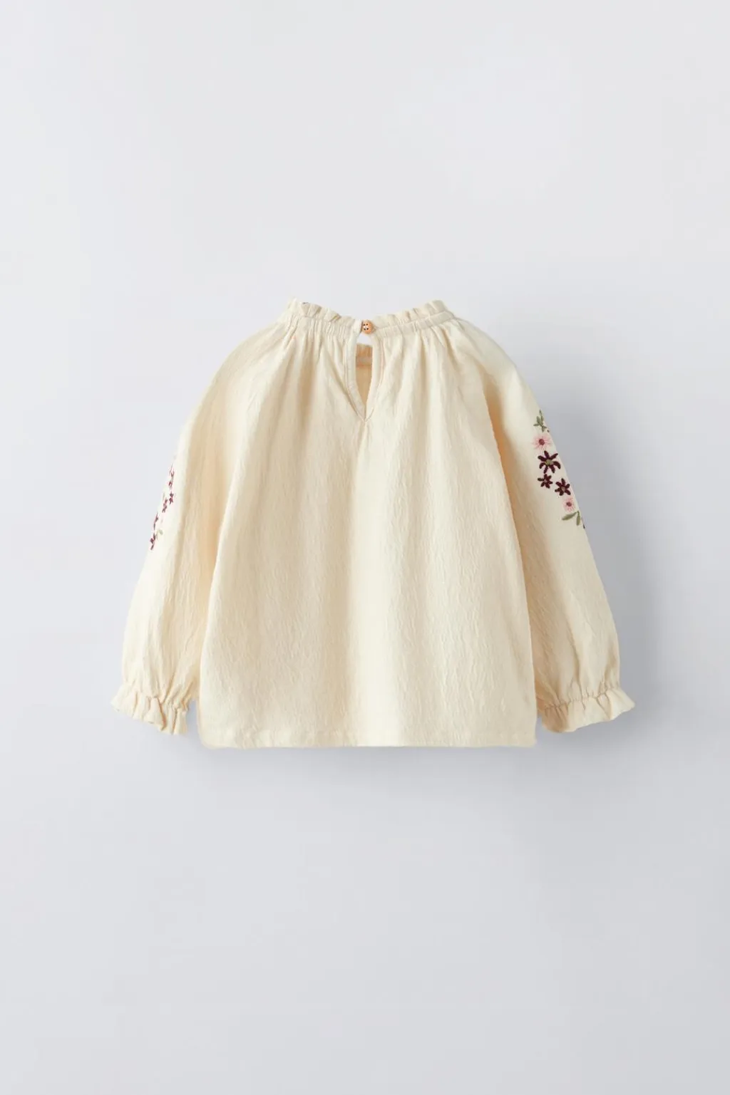 Camiseta con cuello redondo y manga larga acabada en goma. Cierre tipo lágrima con botón en espalda. Detalle bordados en mangas.