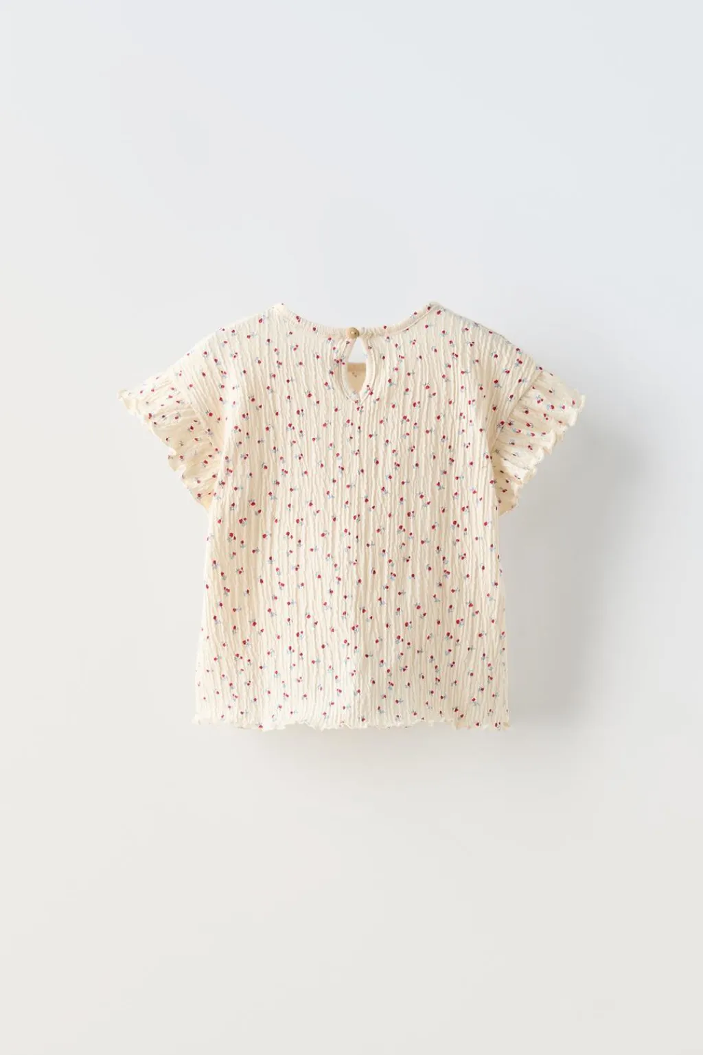 Camiseta con cuello redondo y manga corta acabada en volantes. Cierre en lágrima con botón en espalda. Acabados en rizo.