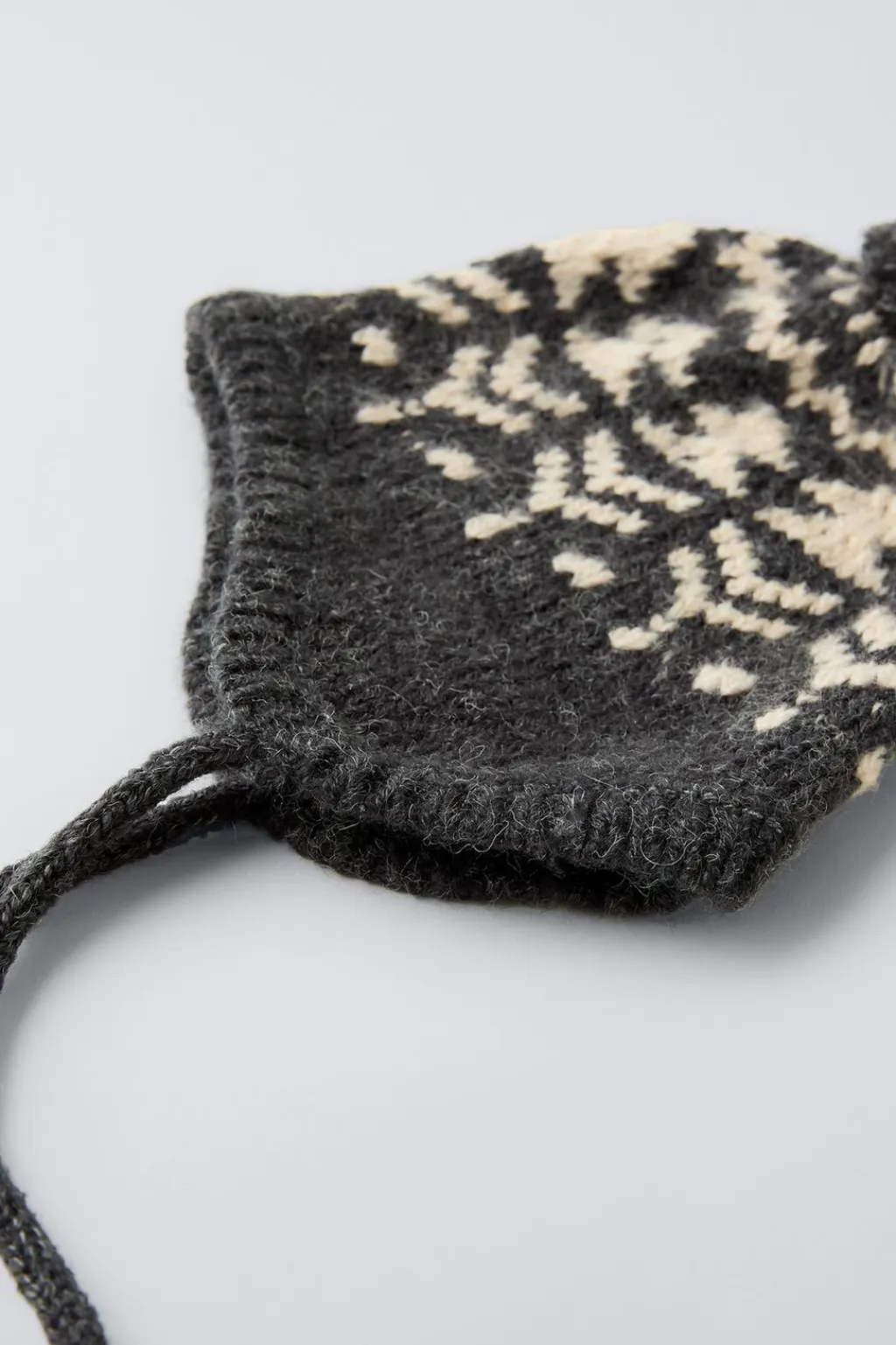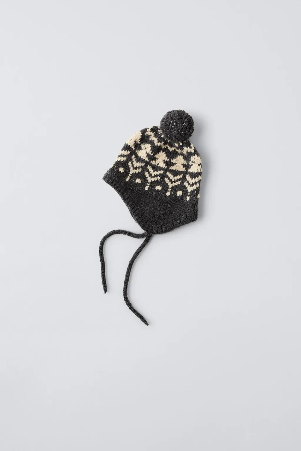 Gorro de punto con cordones ajustables frontal. Aplique pompón.