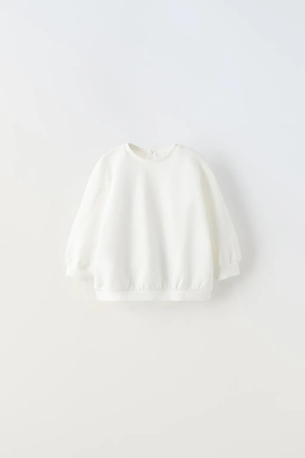Sudadera con cuello redondo y manga larga. Acabados en rib. Cierre en lágrima con botón en espalda.