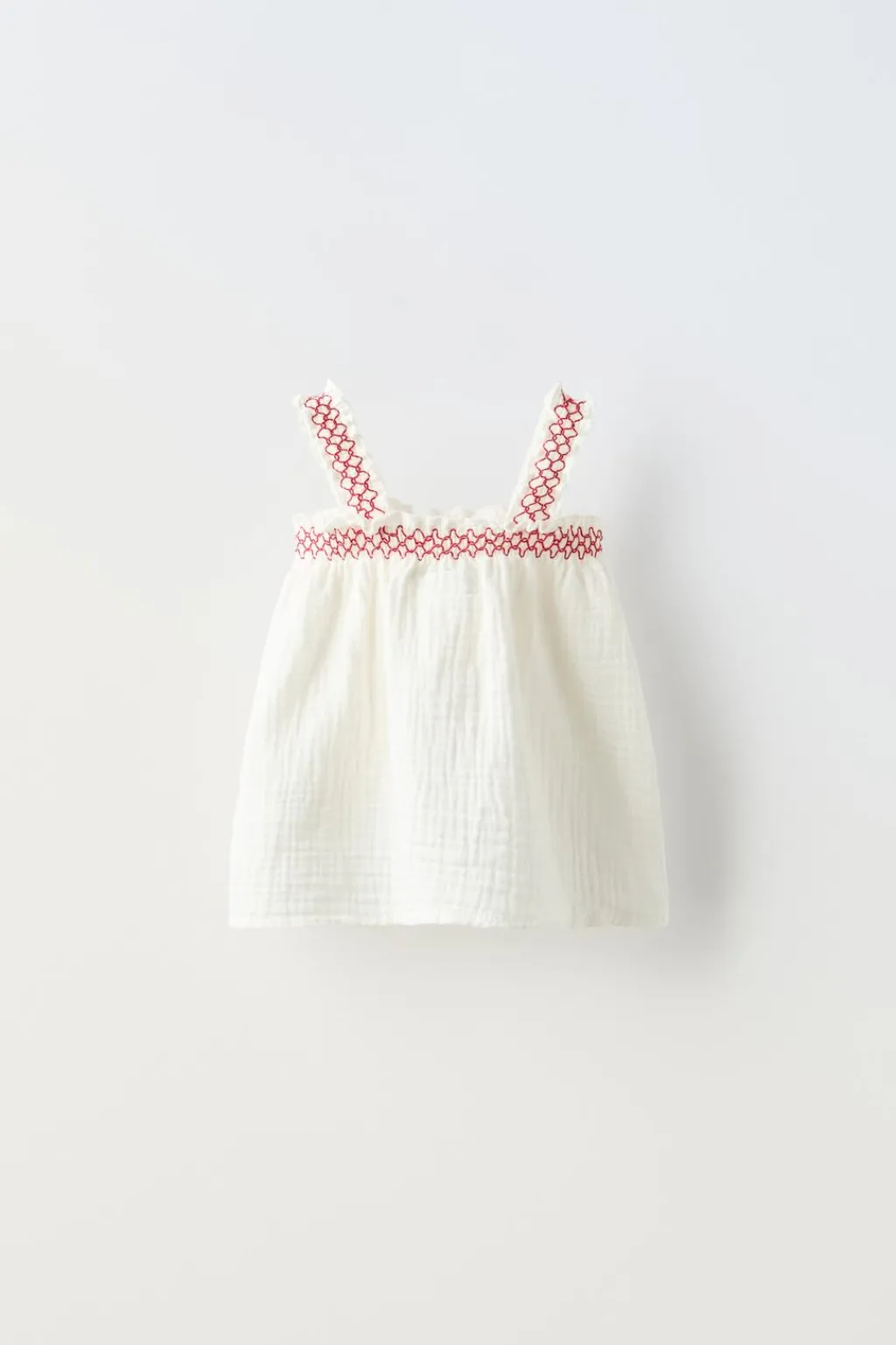 Top con cuello recto y tirantes. Detalle bordados a contraste.