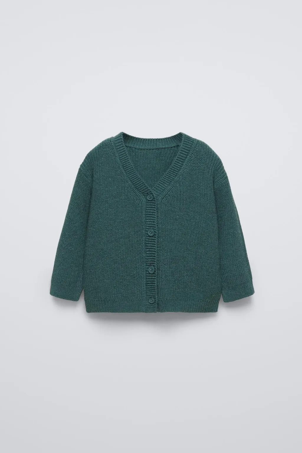 Chaqueta de punto con cuello pico y manga larga. Cierre con botonadura frontal.
