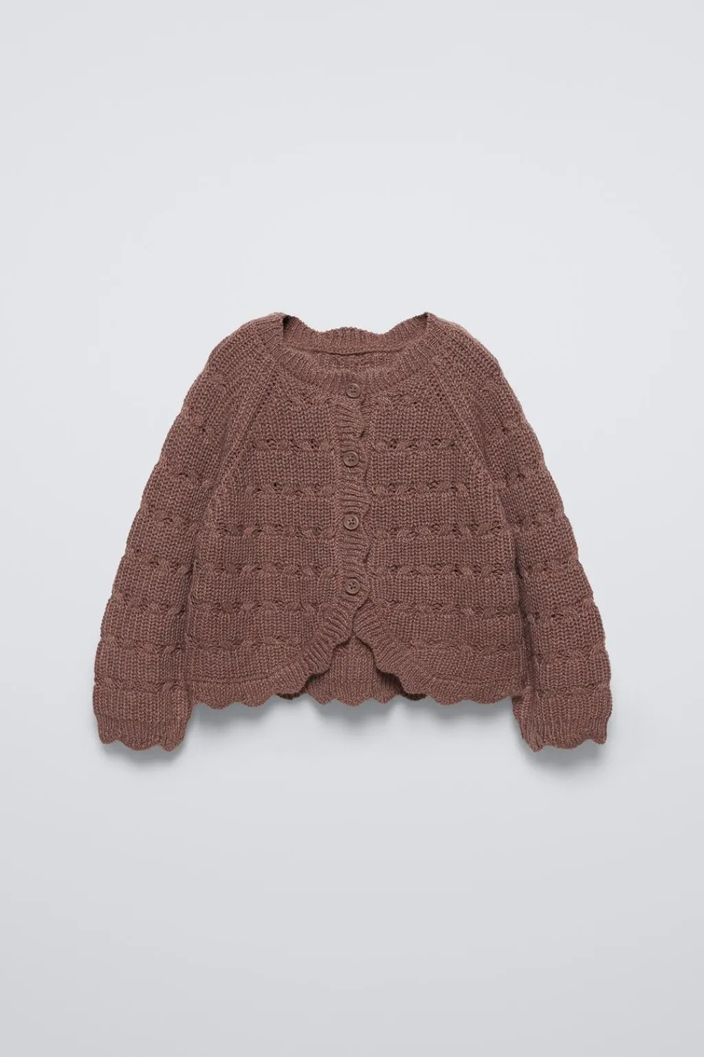 Chaqueta con cuello redondo y manga larga acabada en ondas. Bajo asimétrico acabado en ondas. Cierre botonadura frontal.