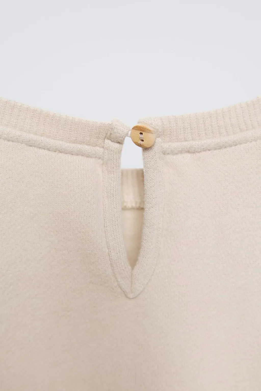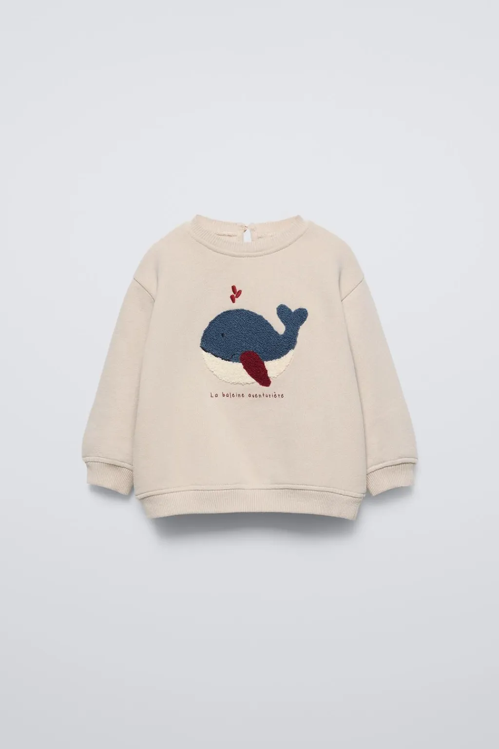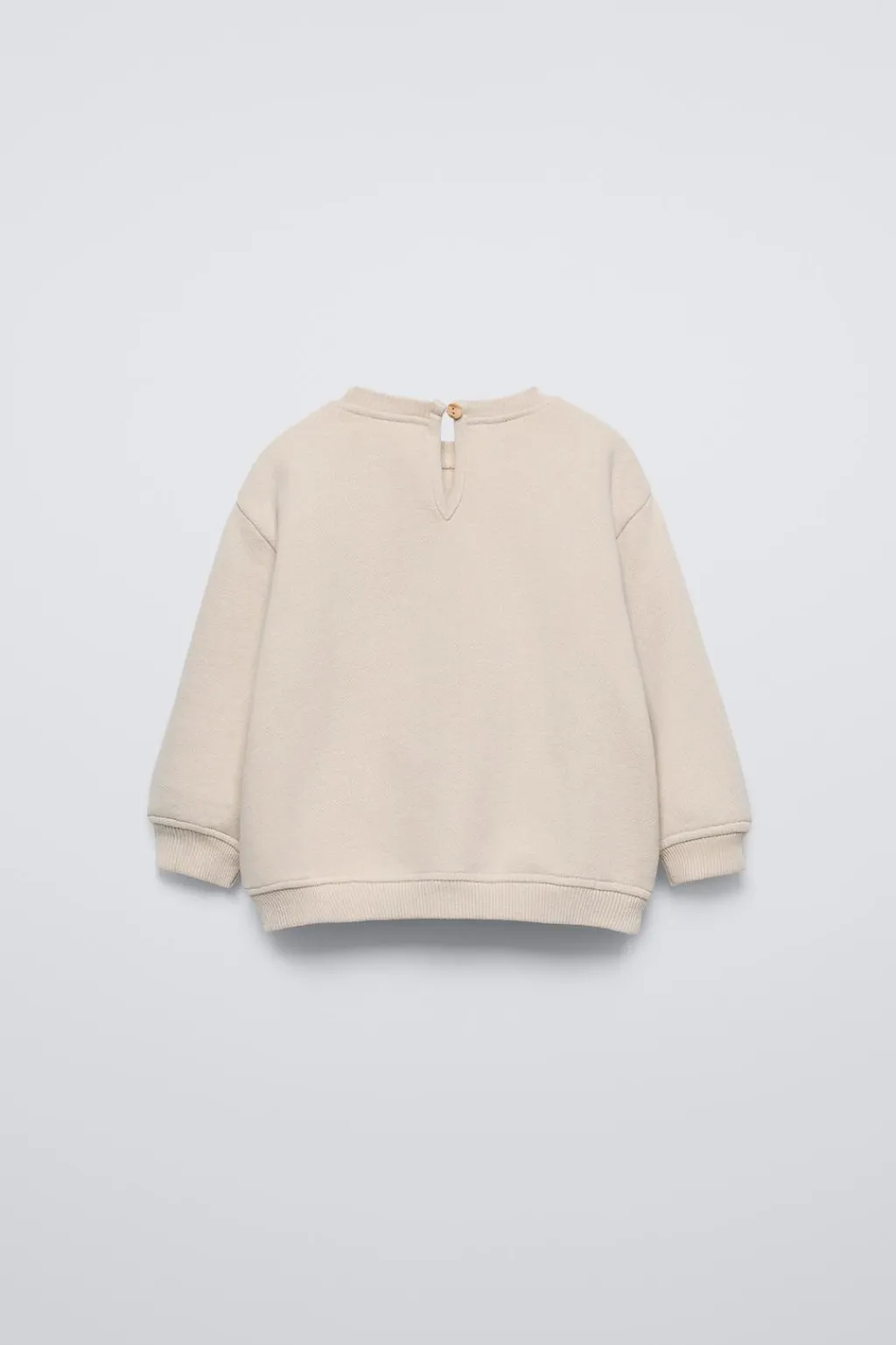 Sudadera con cuello redondo y manga larga. Acabados en rib. Cierre tipo lágrima con botón en espalda. Detalle bordado en delantero en rizo.