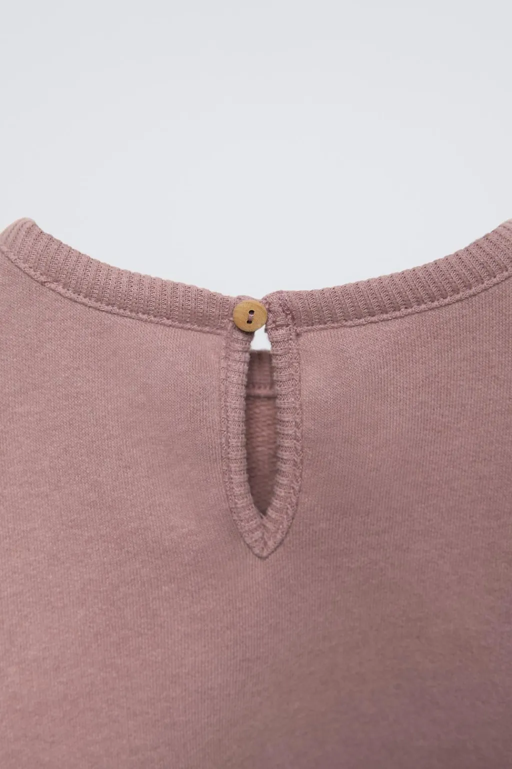 Sudadera con cuello redondo y manga larga. Acabados en rib. Cierre tipo lágrima con botón en espalda. Estampado en delantero.