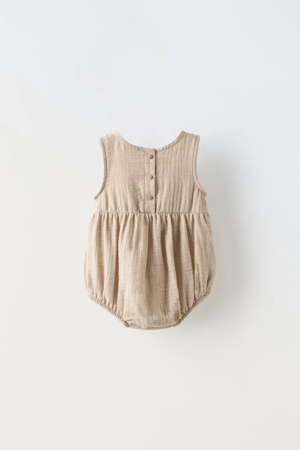 Pelele con cuello redondo y manga sisa. Detalle bordado en pechera. Cierre con botonadura en espalda. Bajo acabado en goma con botones tipo presión ocultos.
