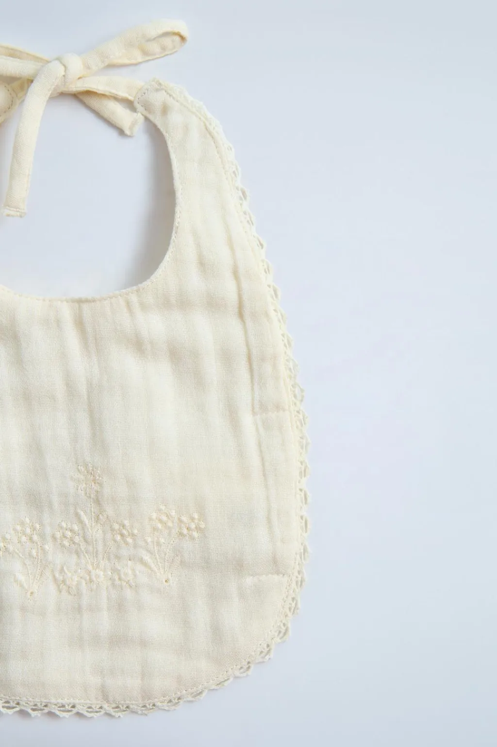 Babero con cordones ajustables en nuca. Acabados en puntilla y detalle bordado.