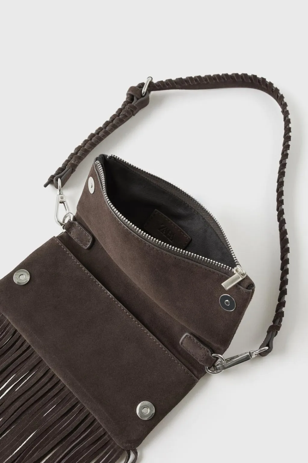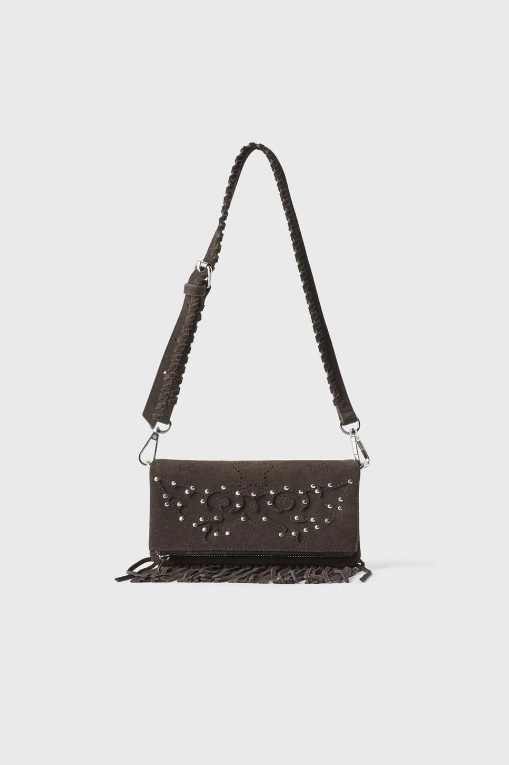 Bolso tipo bandolera de piel con detalle flecos. Compartimento principal tipo sobre con cierre mediante clip. Solapa con cierre mediante cremallera. Asa de hombro ajustable y extraíble.