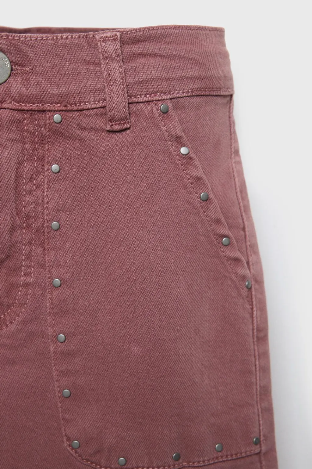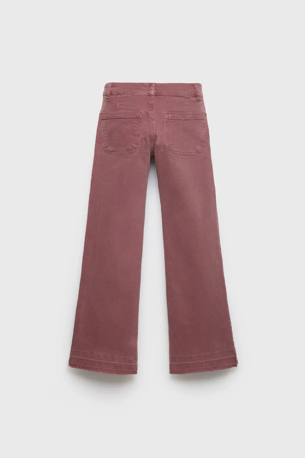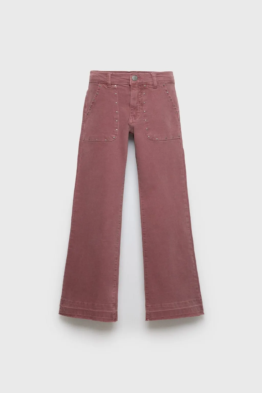 Jeans tipo flare con cierre botón frontal y cremallera oculta. Bolsillos de tipo plastrón en delantero y espalda. Aplique tachas en bolsillos y bajo acabado desflecado.