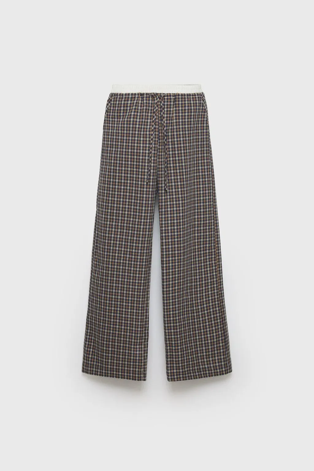 Pantalón de cuadros con doble cinturilla elástica a contraste y cordones ajustables frontal.