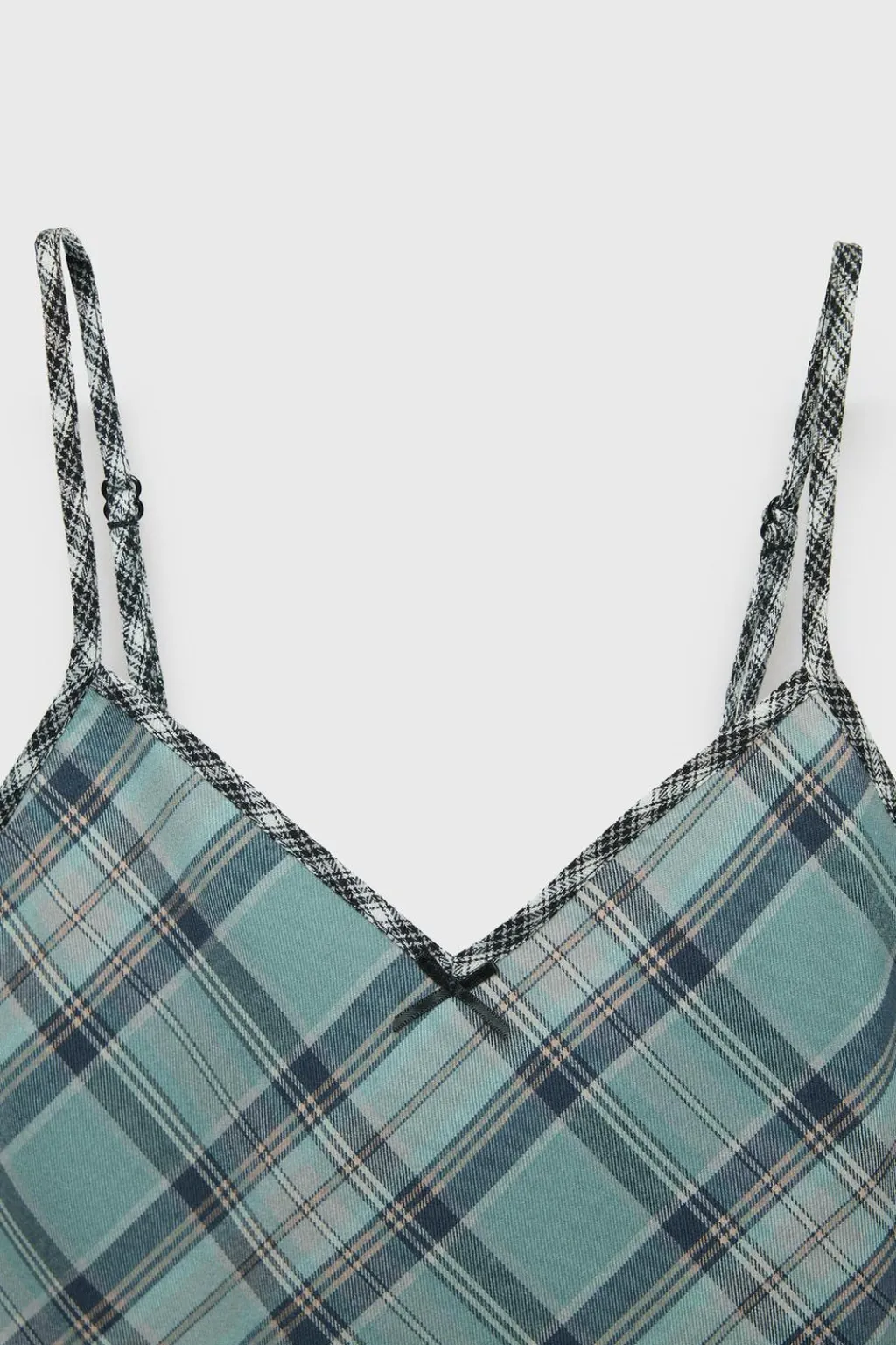 Vestido con cuello pico y tirantes ajustables en espalda. Aplique lacito en pechera. Estampado de cuadros.