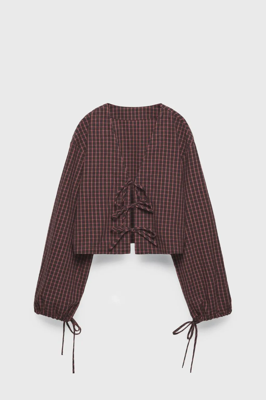 Blusa de cuadros con cuello pico y manga larga acabada en ajustable por cordón. Cierre frontal con lacitos.