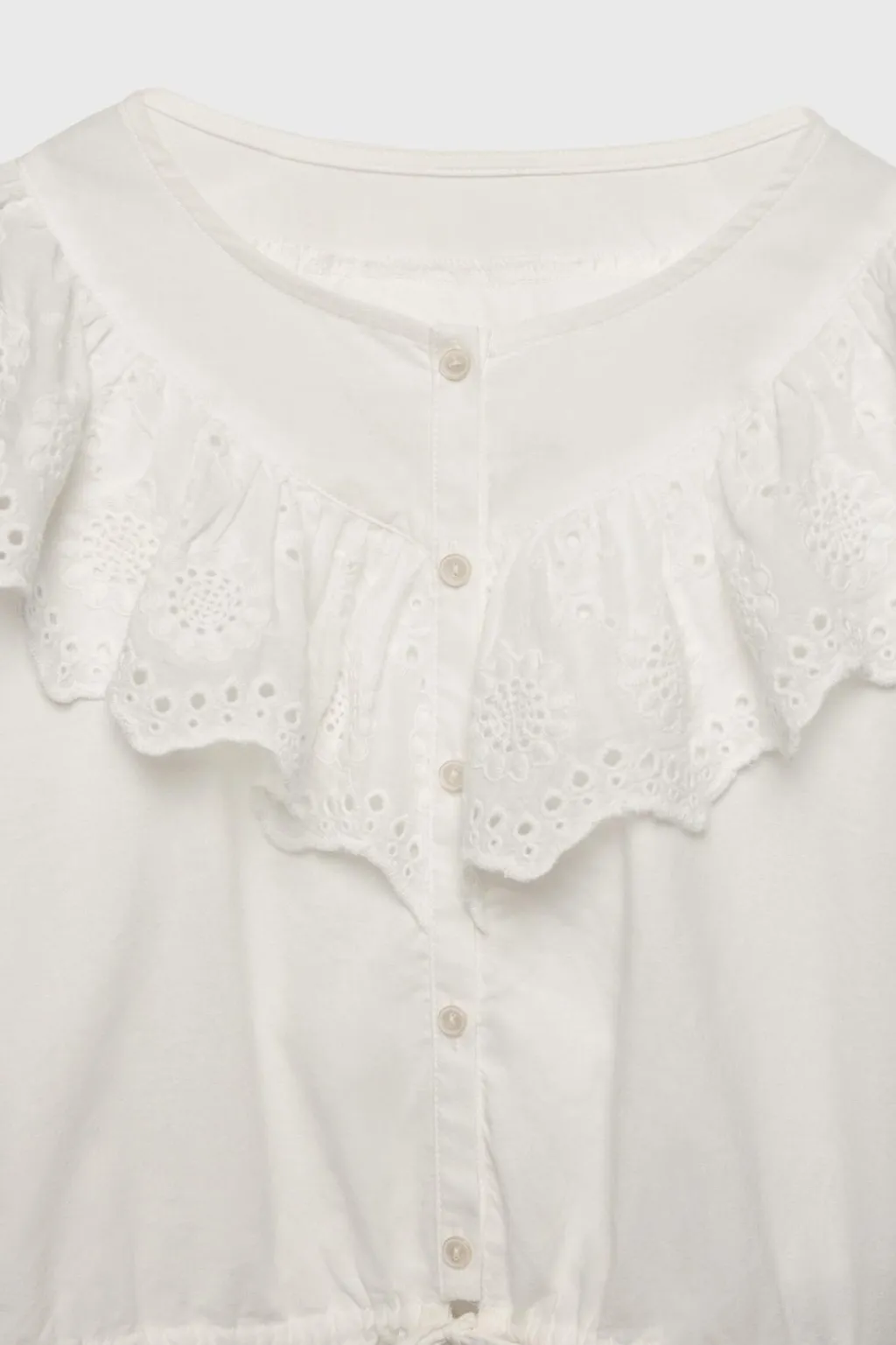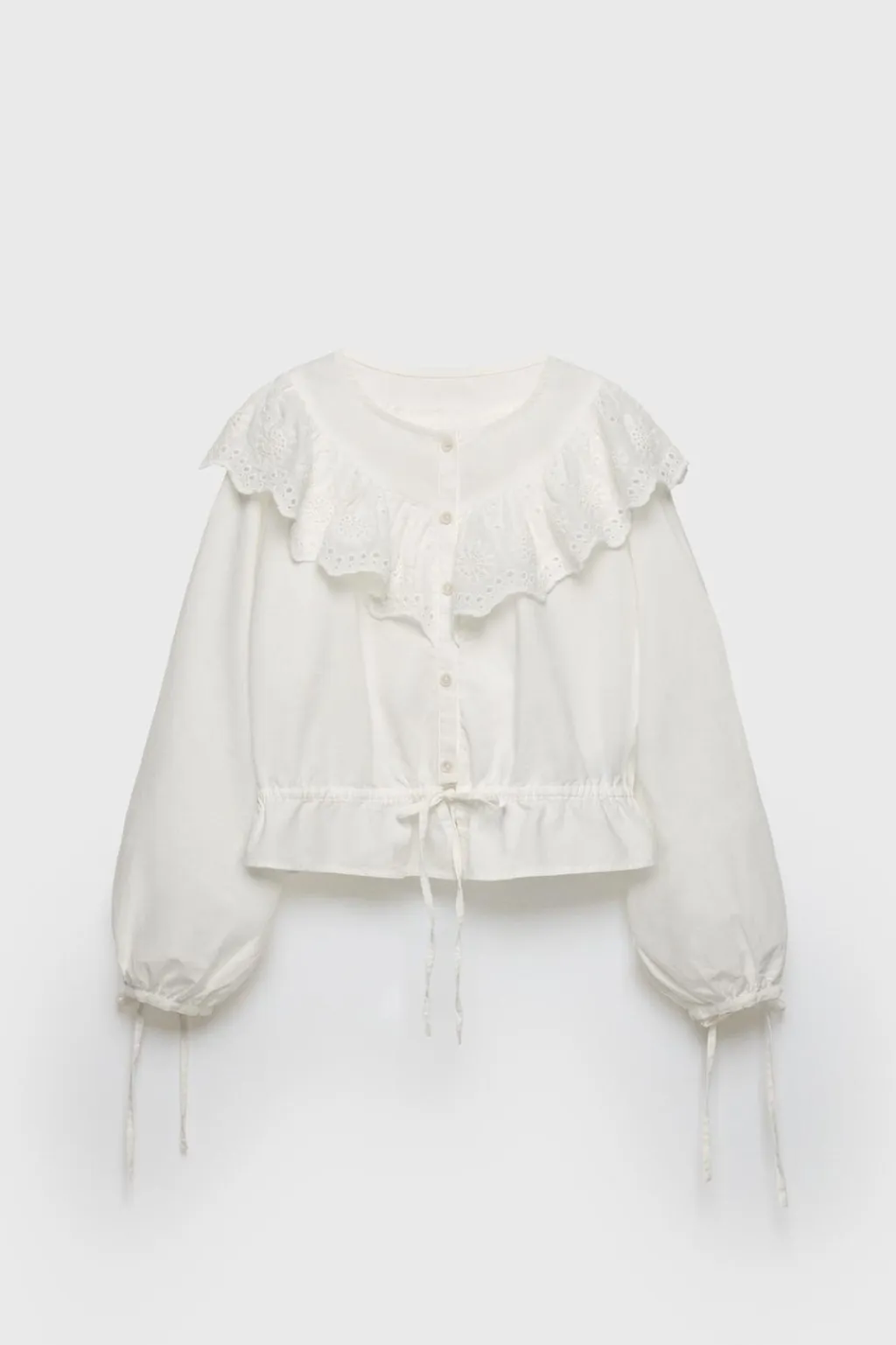 Blusa con cuello redondo y manga larga acabada con lazo ajustable. Cierre botonadura en frontal. Aplique volante con puntilla en pechera y espalda. Detalle lazo ajustable en cintura.