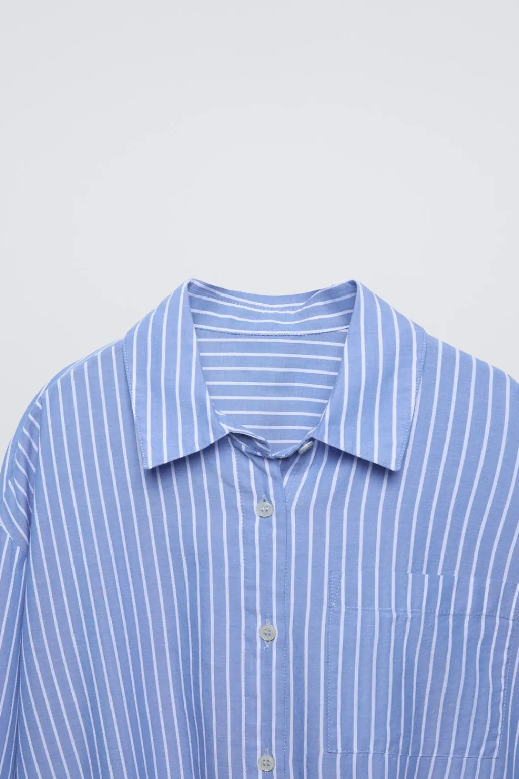 Camisa de rayas con cuello camisero y manga larga acabada en cierre botones. Cierre botonadura en frontal. Bolsillo de tipo plastrón en pechera.