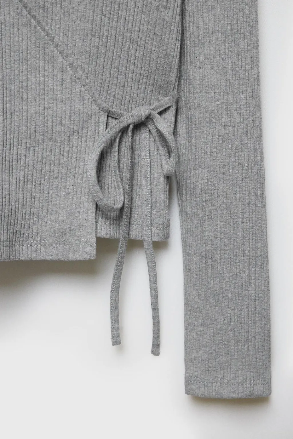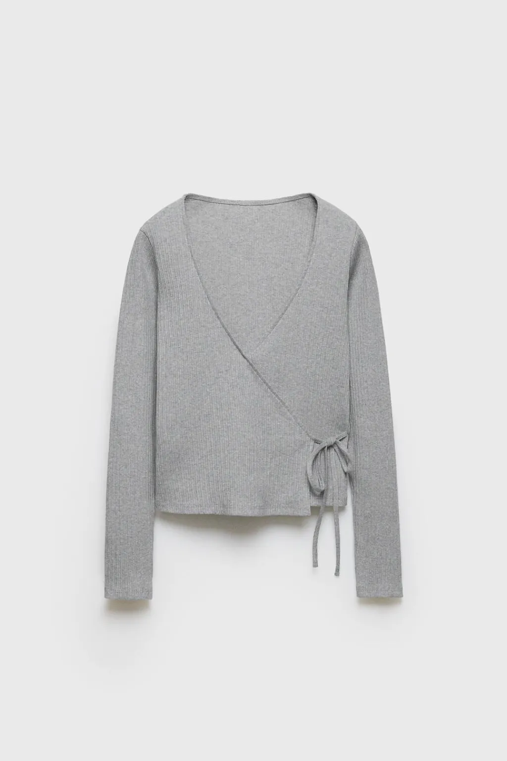 Camiseta con cuello pico y manga larga. Cierre cruzado frontal con aplique lazo lateral.