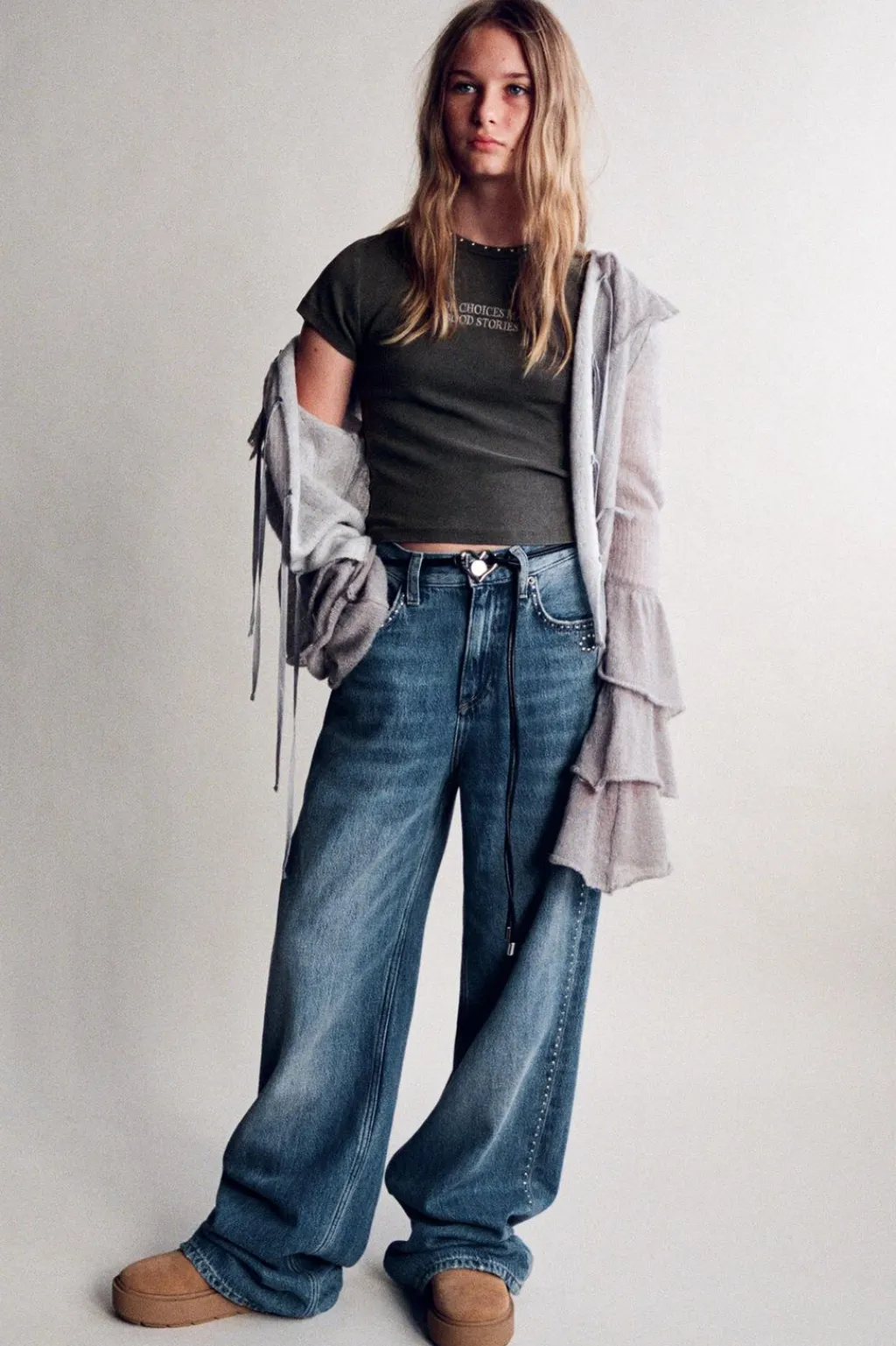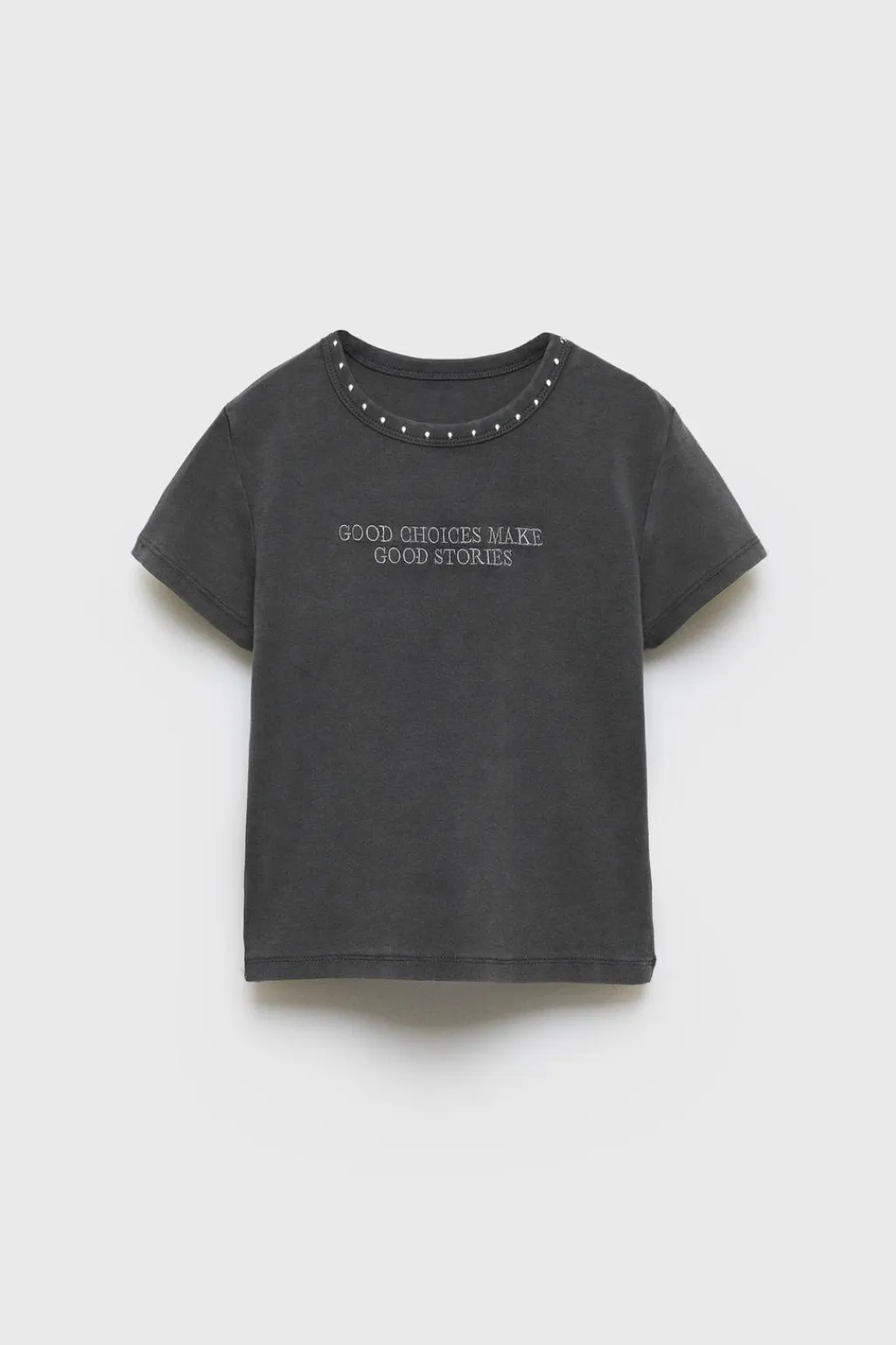 Camiseta con cuello redondo y manga larga. Detalle de bordado en pechera y aplique tachas en cuello.