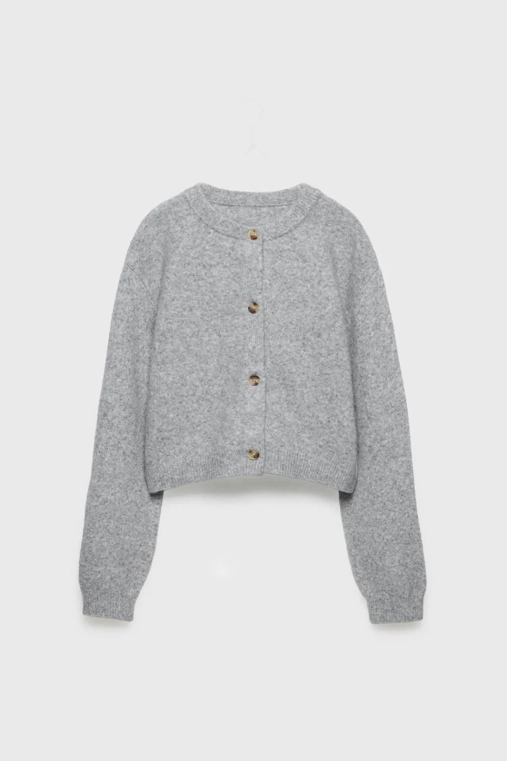 Chaqueta de punto con cuello redondo y manga larga. Cierre de botonadura frontal.