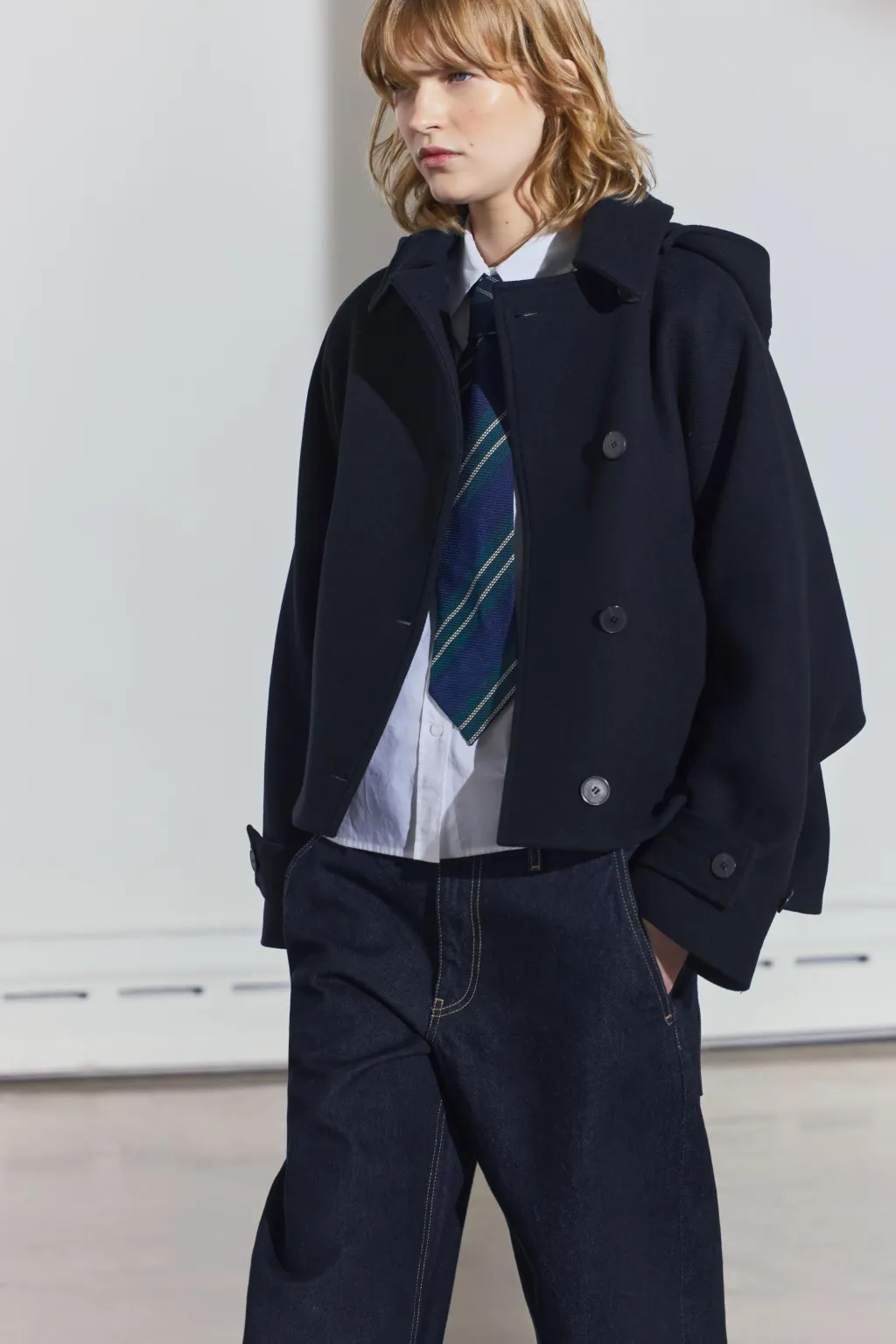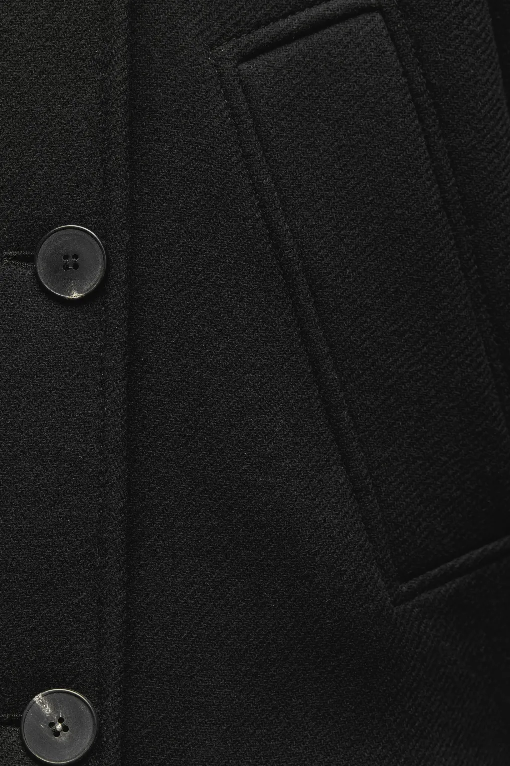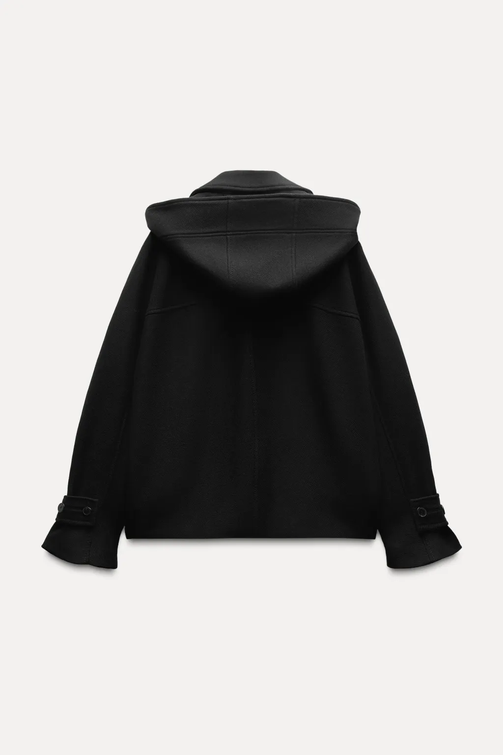 Abrigo tipo capa confeccionado en hilatura con mezcla de lana. Cuello solapa con capucha y manga larga acabada en trabillas y botón. Forro interior a tono. Cierre frontal con botones.