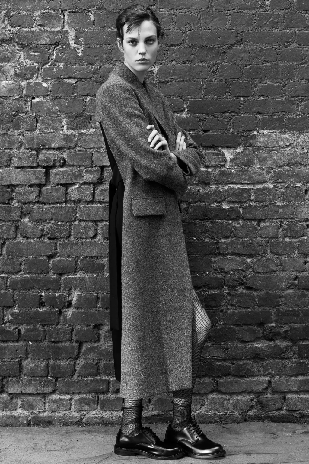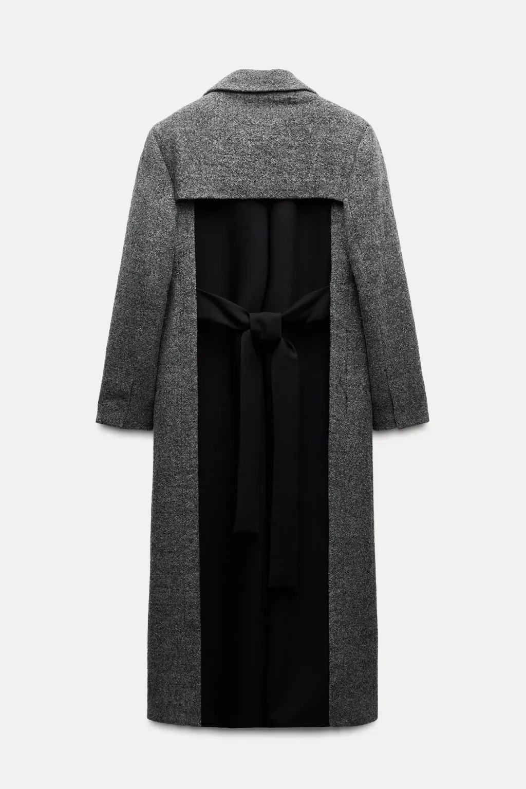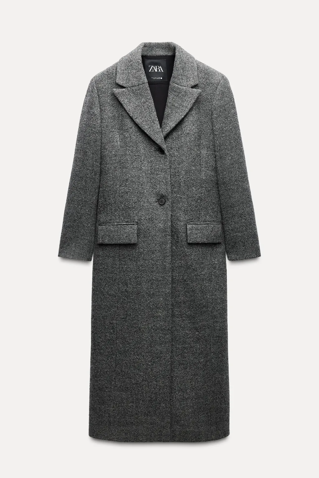 Abrigo largo confeccionado en hilatura de lana 100%. Cuello solapa de muescas y manga larga acabada en abertura y botones. Bolsillos con solapa en delantero. Detalle de aplicación de tejido en espalda a contraste. Cierre frontal con botones ocultos por solapa.