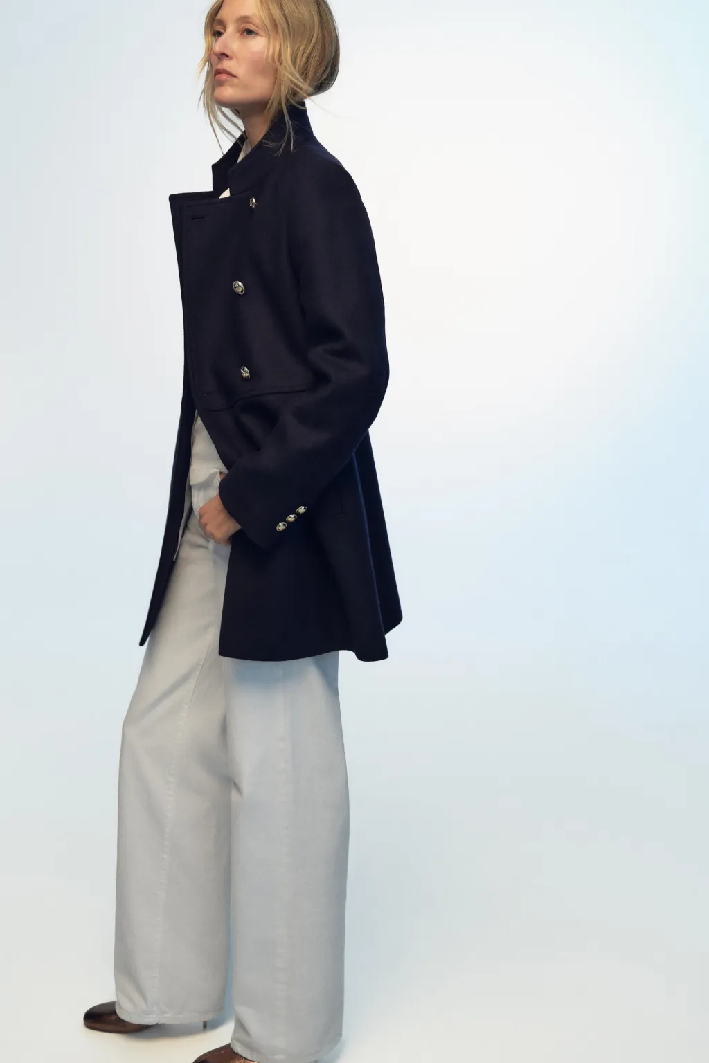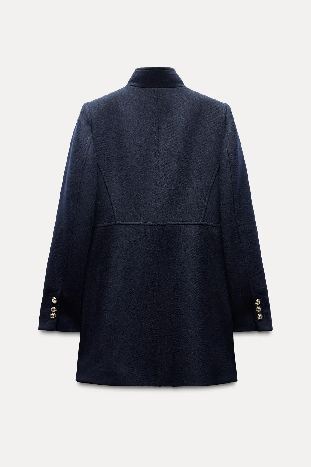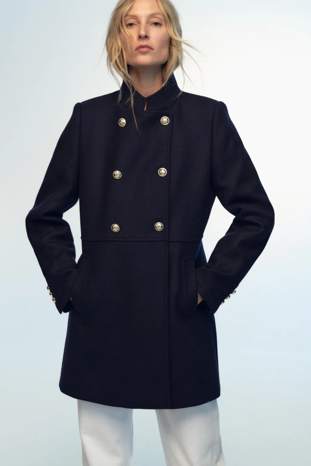 Abrigo confeccionado con lana. Cuello subido y manga larga. Bolsillos delanteros de vivo. Cierre frontal cruzado con botones dorados.