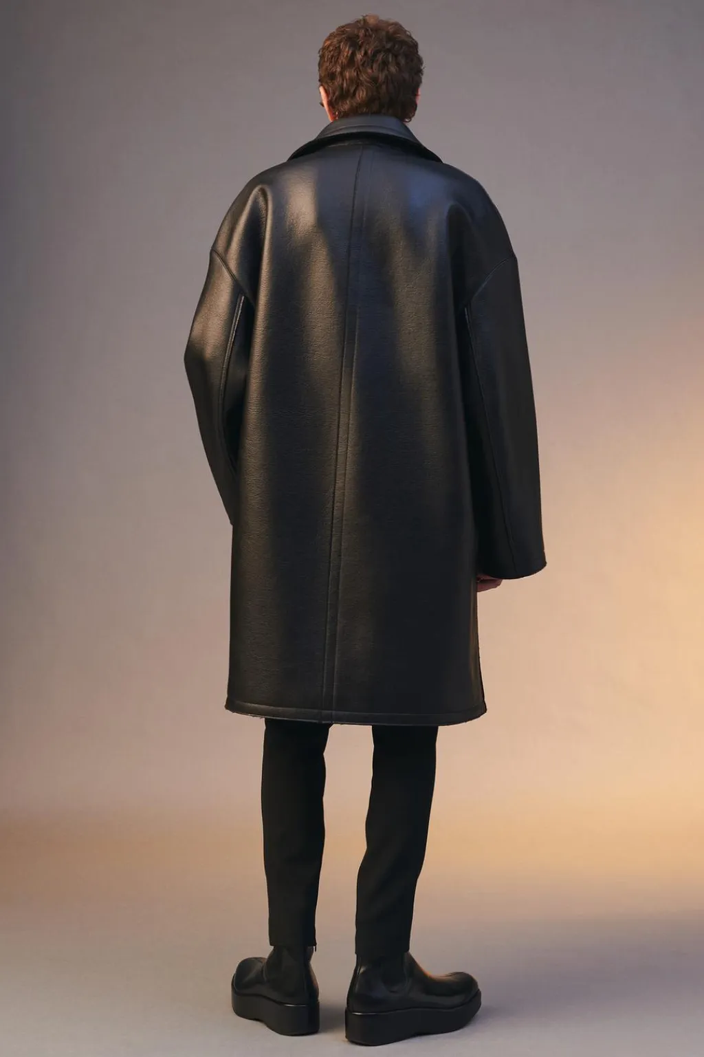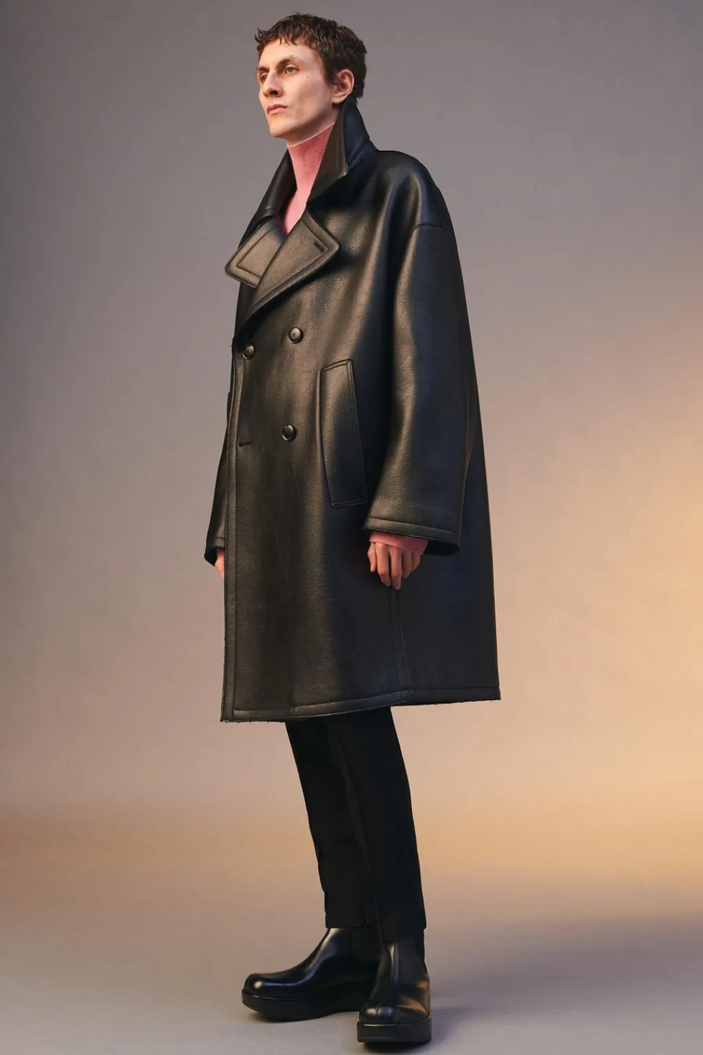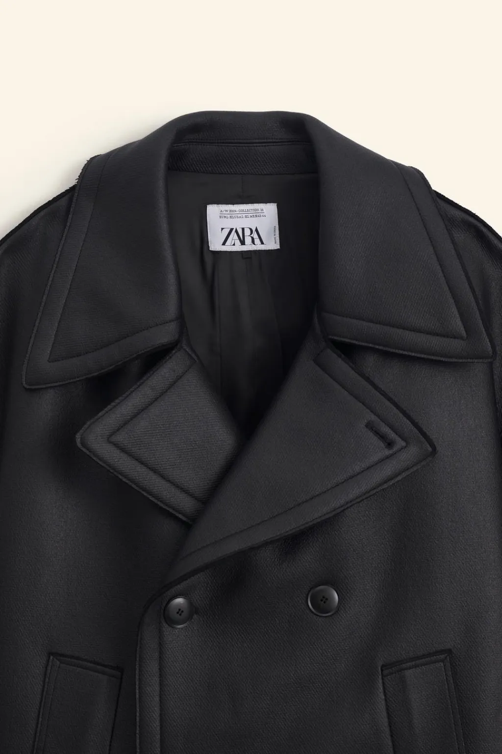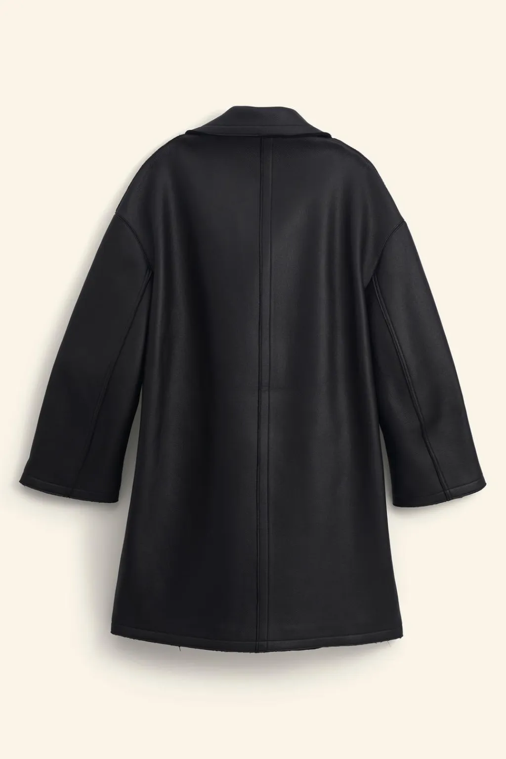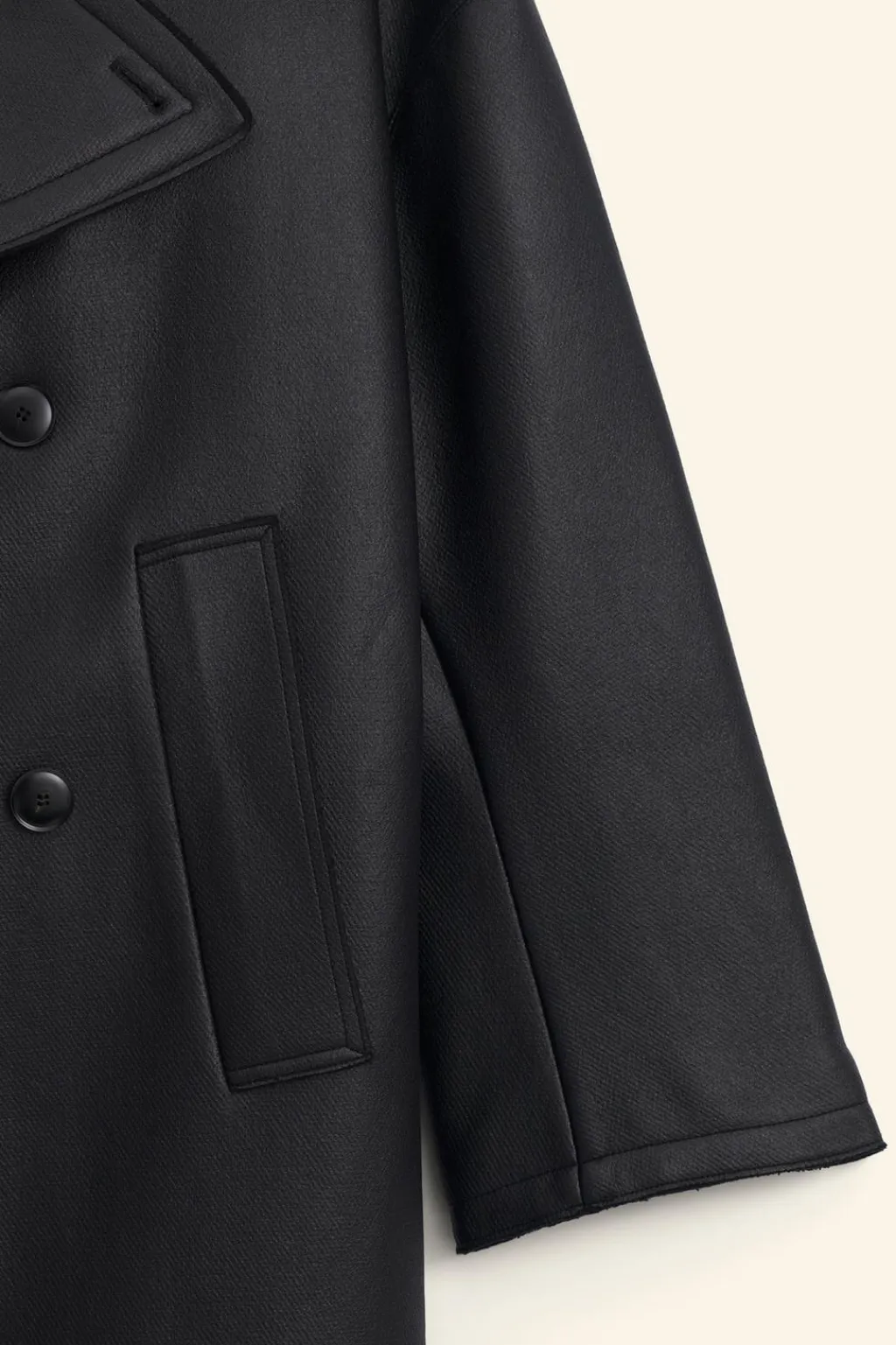 Abrigo relaxed fit confeccionado en tejido con lana y acabado efecto engomado. Cuello con solapas amplias de muesca y manga larga ancha. Bolsillos de vivo en cadera y detalle de bolsillo interior. Cierre frontal de botonadura cruzada.