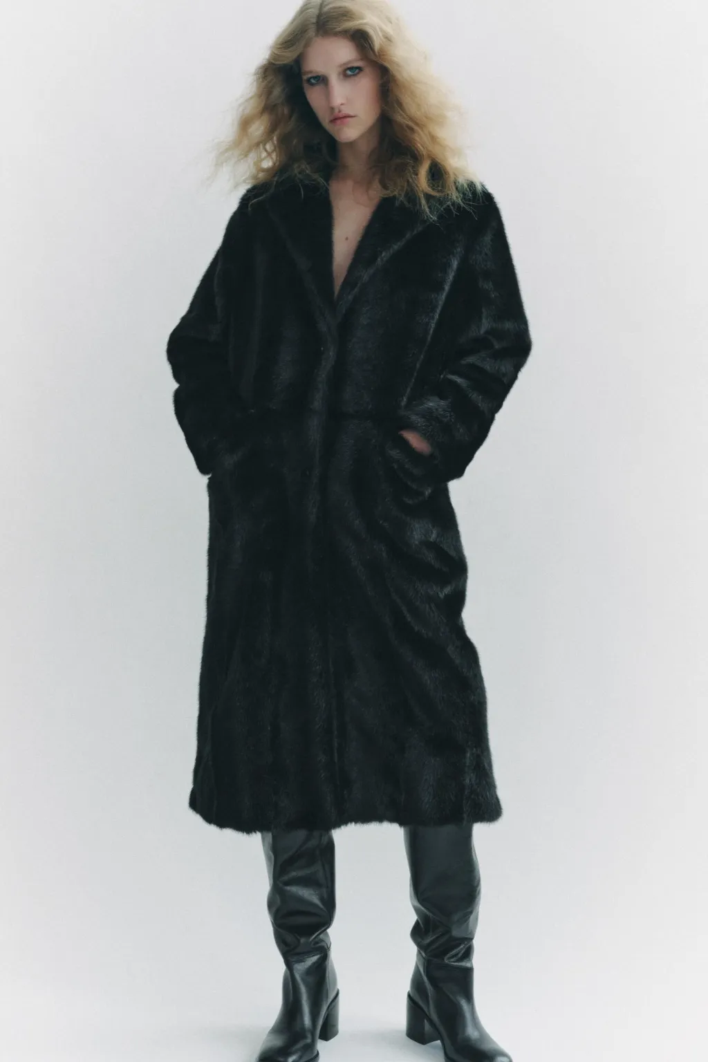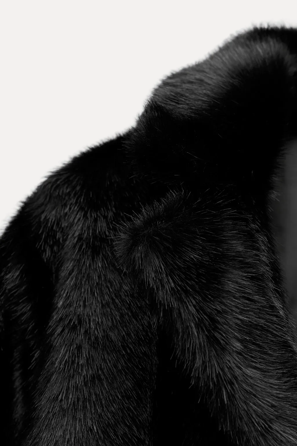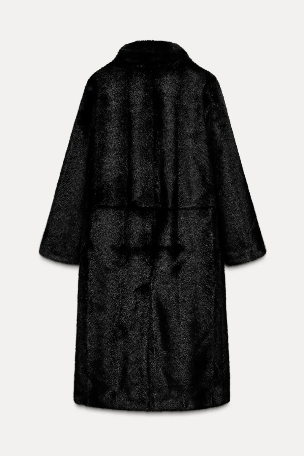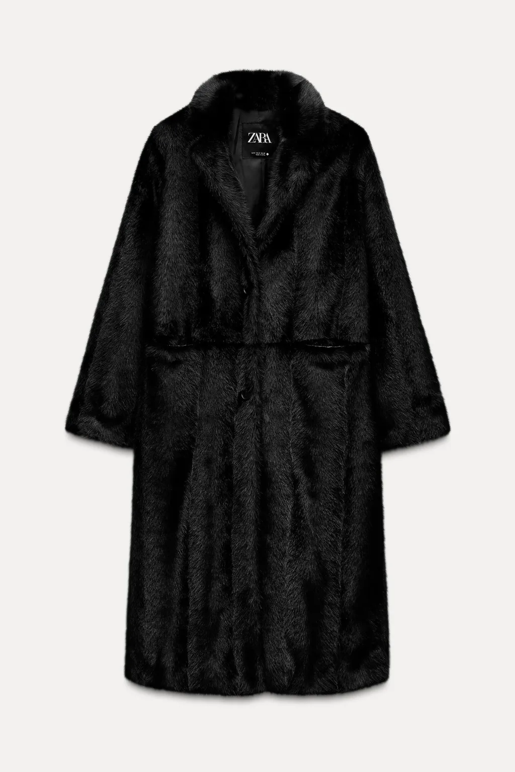 Abrigo de cuello solapa con manga larga. Bolsillos delanteros. Detalle de aplicación efecto pelo. Forro interior a tono. Cierre frontal con botones.