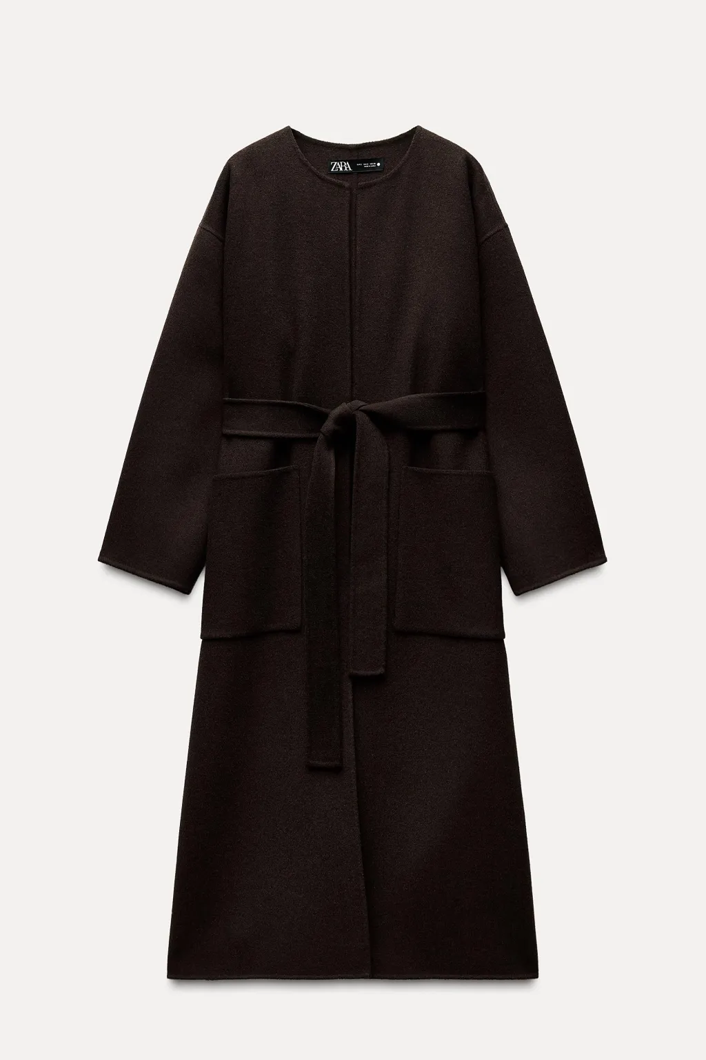 Abrigo abierto confeccionado en hilatura con mezcla de lana. Manga larga. Bolsillos de plastrón en delantero. Cinturón en mismo tejido ajustable con lazadas. Bajo acabado en aberturas laterales.