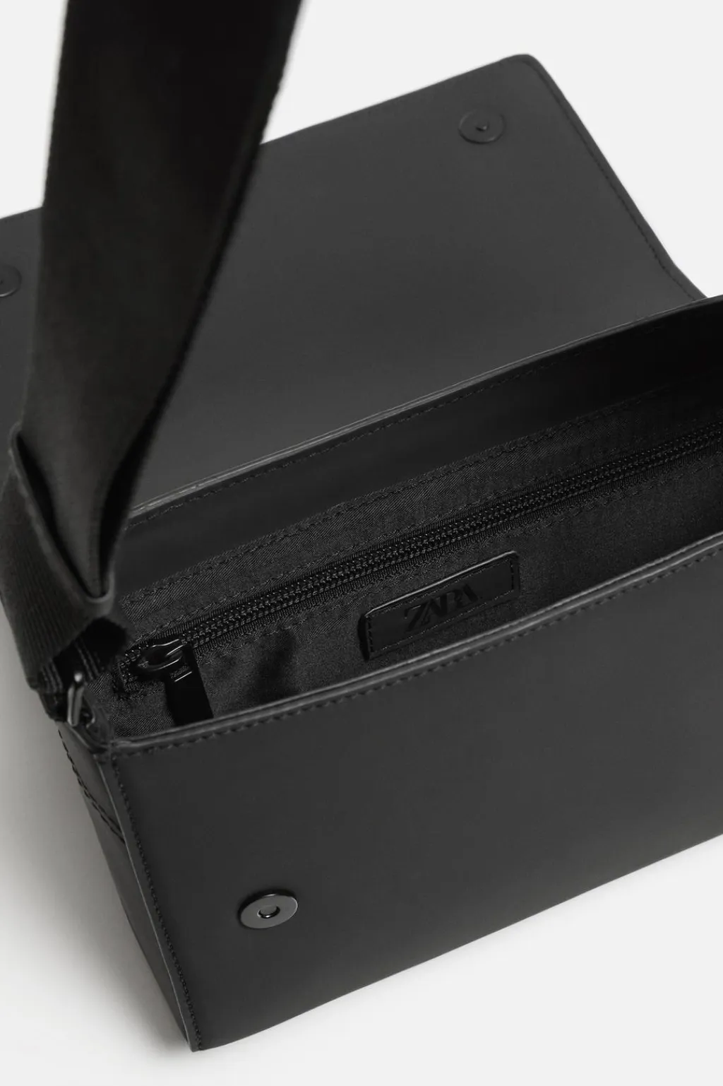 Bandolera con acabado engomado. Compartimento principal con cierre mediante solapa. El interior cuenta con un bolsillo plano con cierre mediante cremallera. Asa de hombro ajustable con monedero.