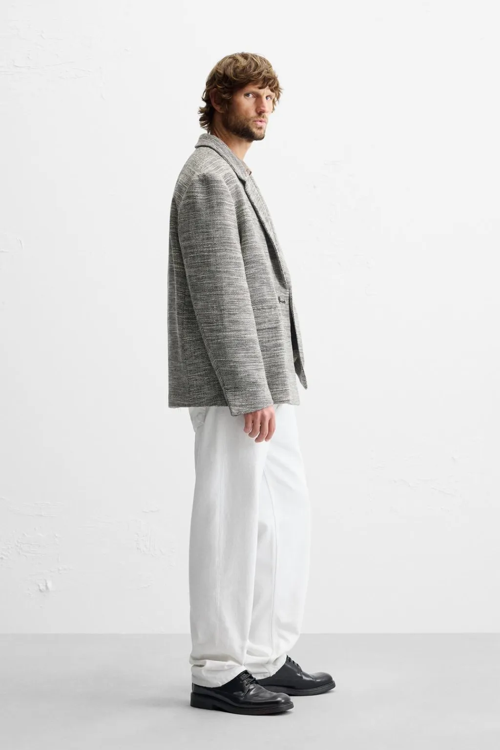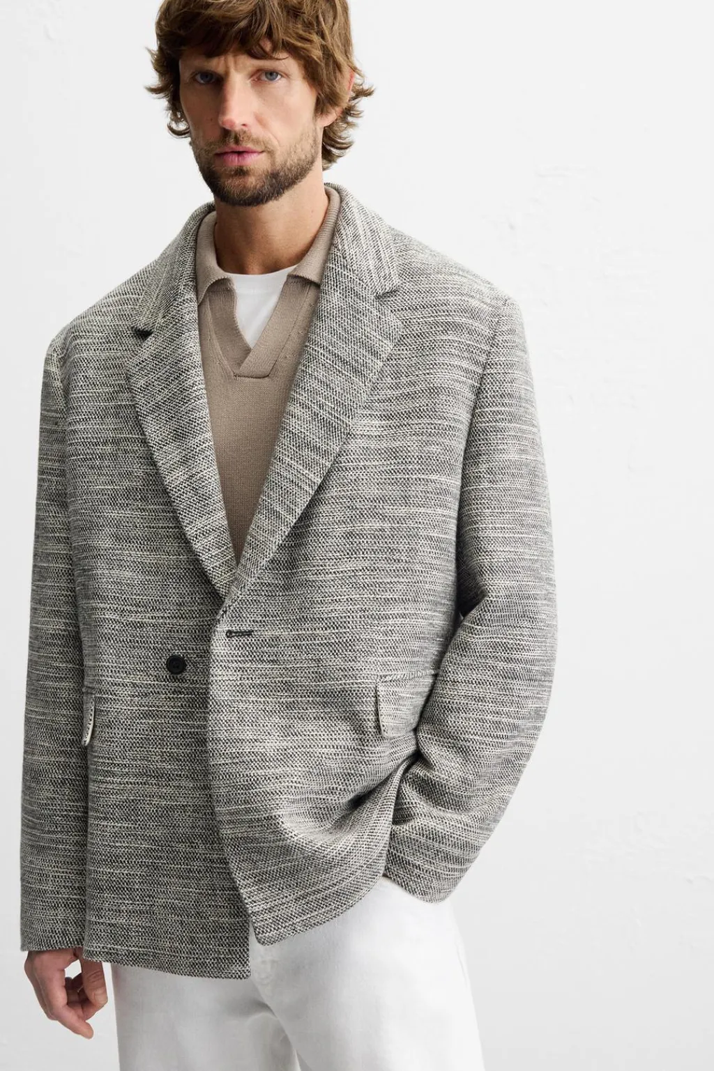 Blazer relaxed fit. Cuello con solapas de muesca y manga larga acabada en puño con botón. Bolsillos de plastrón en cadera y detalle de bolsillo interior. Bajo con abertura en centro espalda. Cierre frontal de botonadura cruzada.