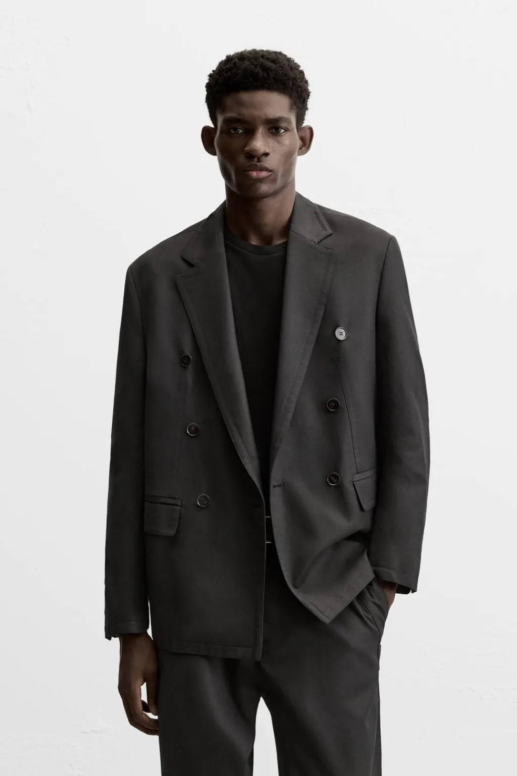 Blazer relaxed fit confeccionada en tejido con viscosa. Cuello con solapas de muesca y manga larga acabada en puño con botones. Bolsillos de solapa en cadera. Detalle de bolsillo interior. Bajo con abertura en centro espalda. Cierre frontal de botonadura cruzada.