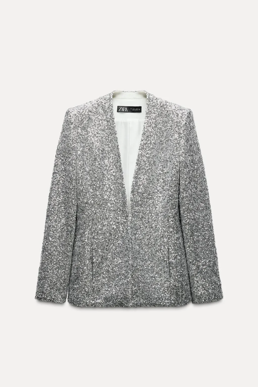 Blazer sin solapa con manga larga y hombreras. Bolsillos delanteros. Cierre frontal con corchete oculto.