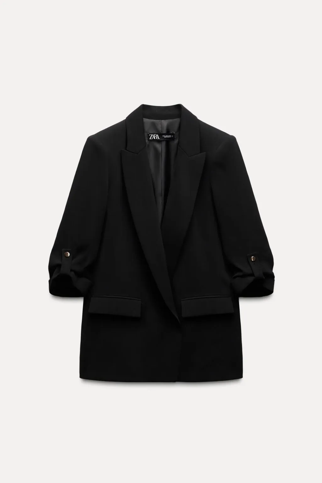 Blazer abierta de cuello solapa y hombreras. Manga por debajo del codo acabada en vuelta con trabilla y botón dorado. Bolsillos delanteros con solapa.