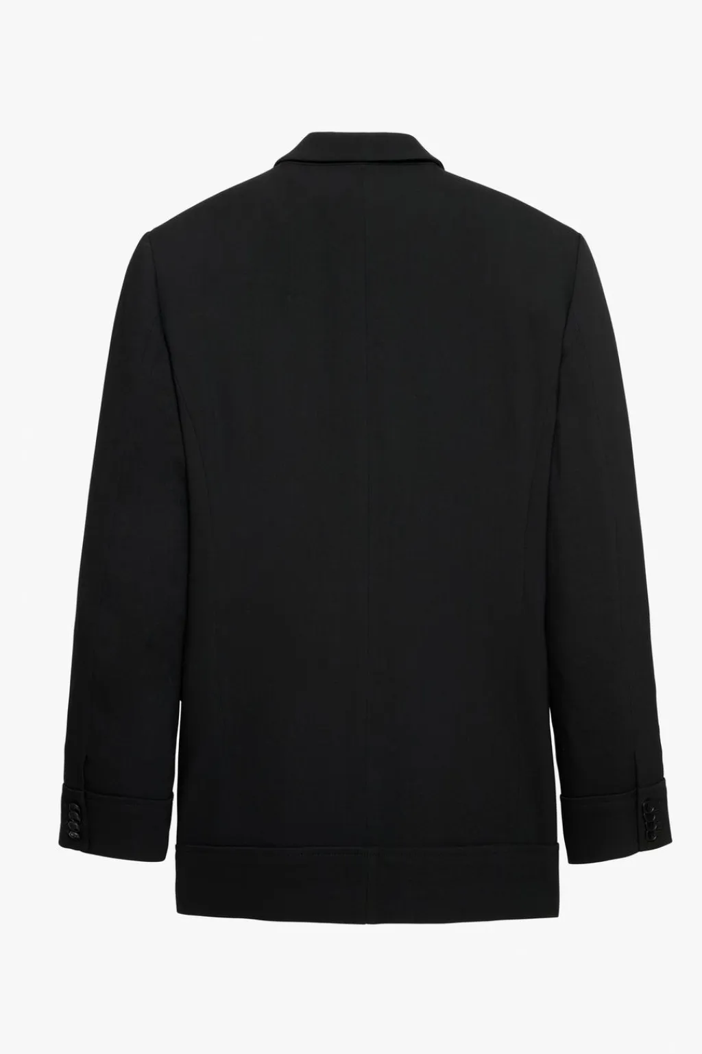 Blazer larga relaxed fit confeccionada en tejido fluido de lana y viscosa. Cuello con solapas de pico y manga larga acabada en puño con botones. Bolsillos de vivo en pecho y de solapa en cadera. Detalle de bolsillo interior. Cierre frontal de botonadura.