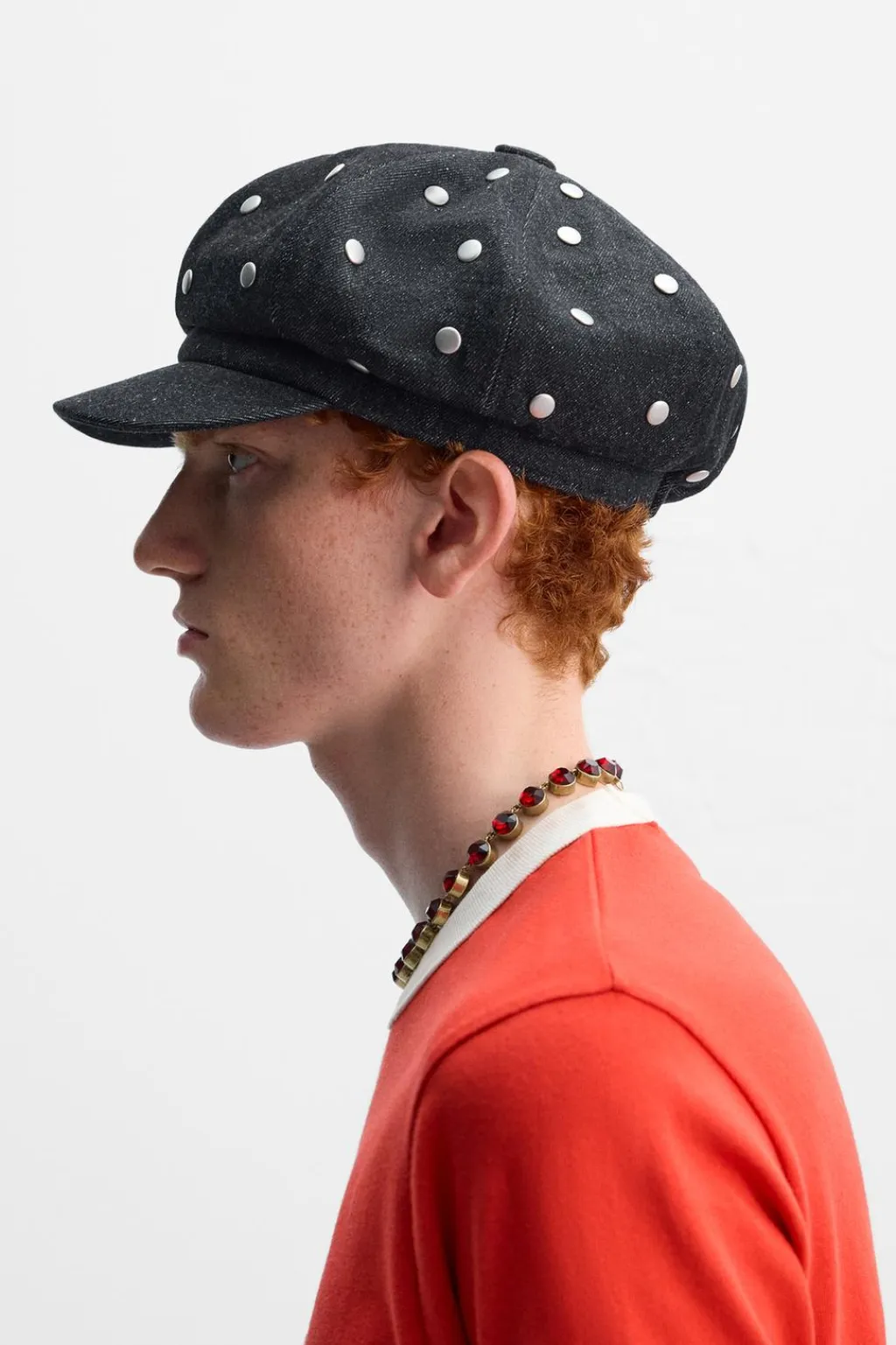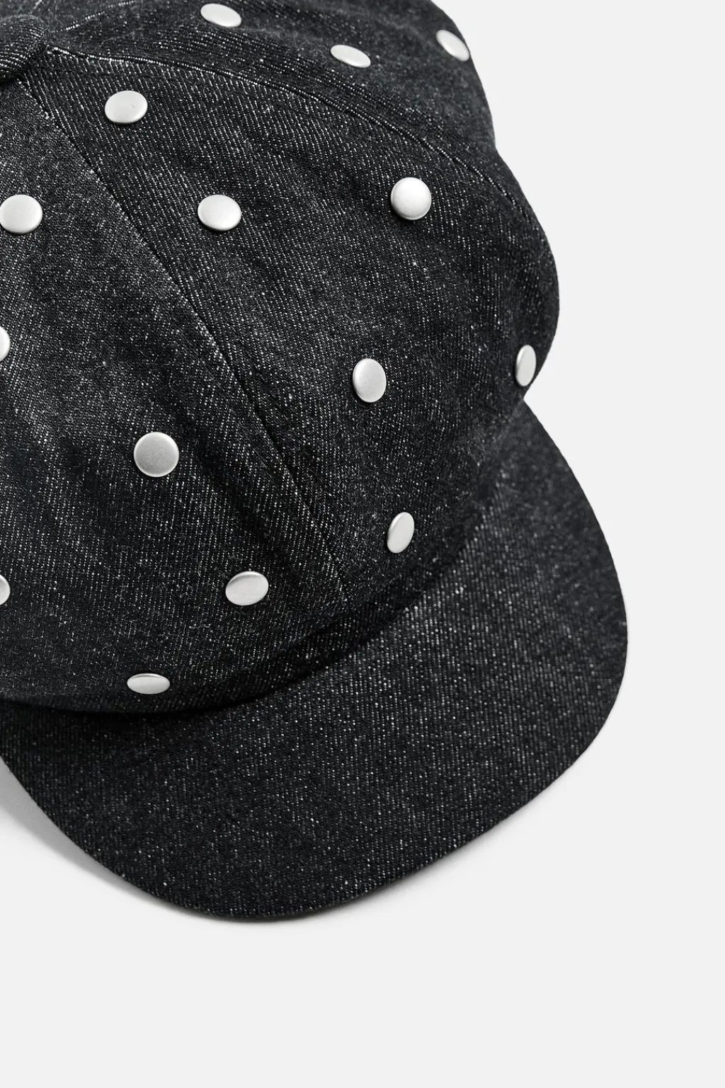 Boina con visera confeccionada en denim de algodón. Aplicación de tachas metálicas.