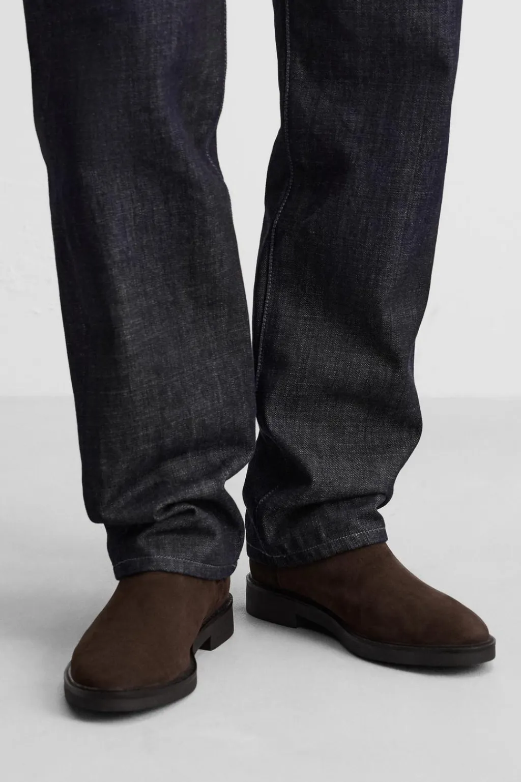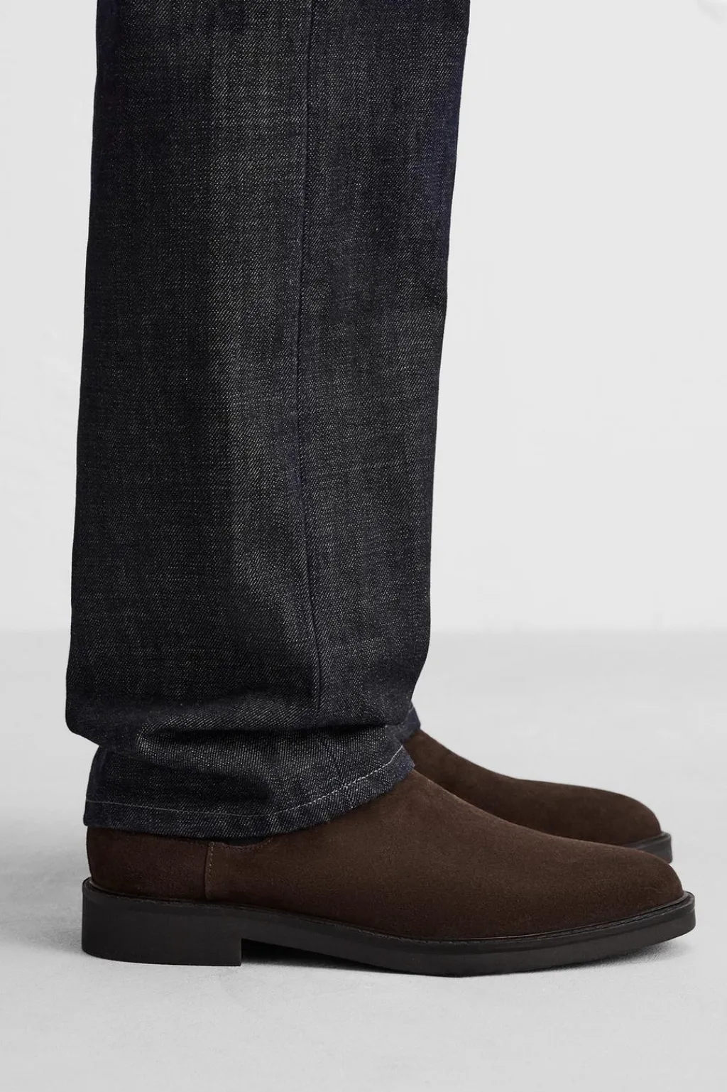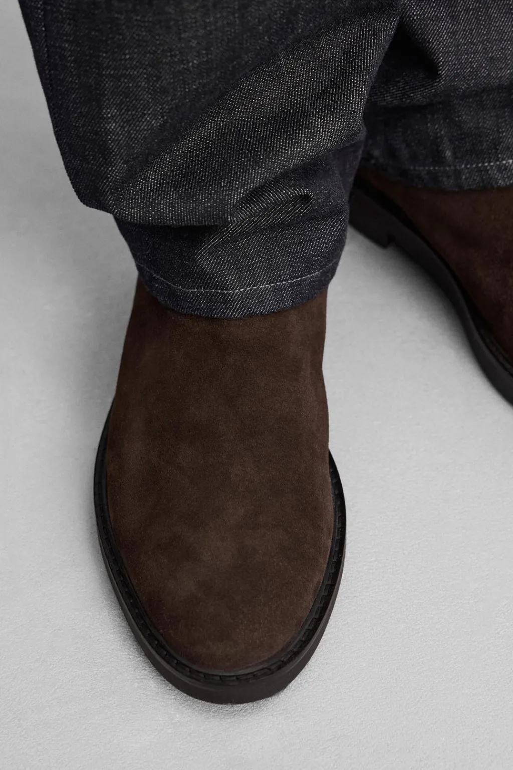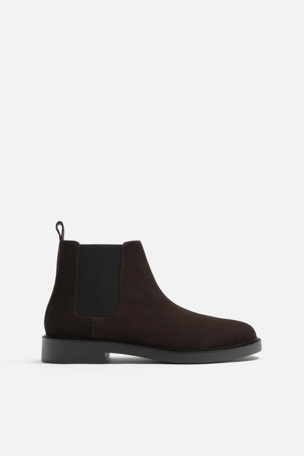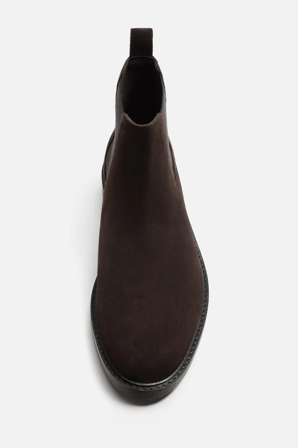 Bota tipo chelsea. Parte superior fabricada en piel con acabado serraje. Cuenta con dos piezas elásticas laterales y tirador trasero para facilitar el calce. Horma redonda. Suela con ligero tacón.