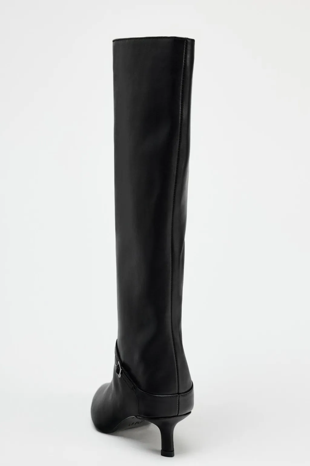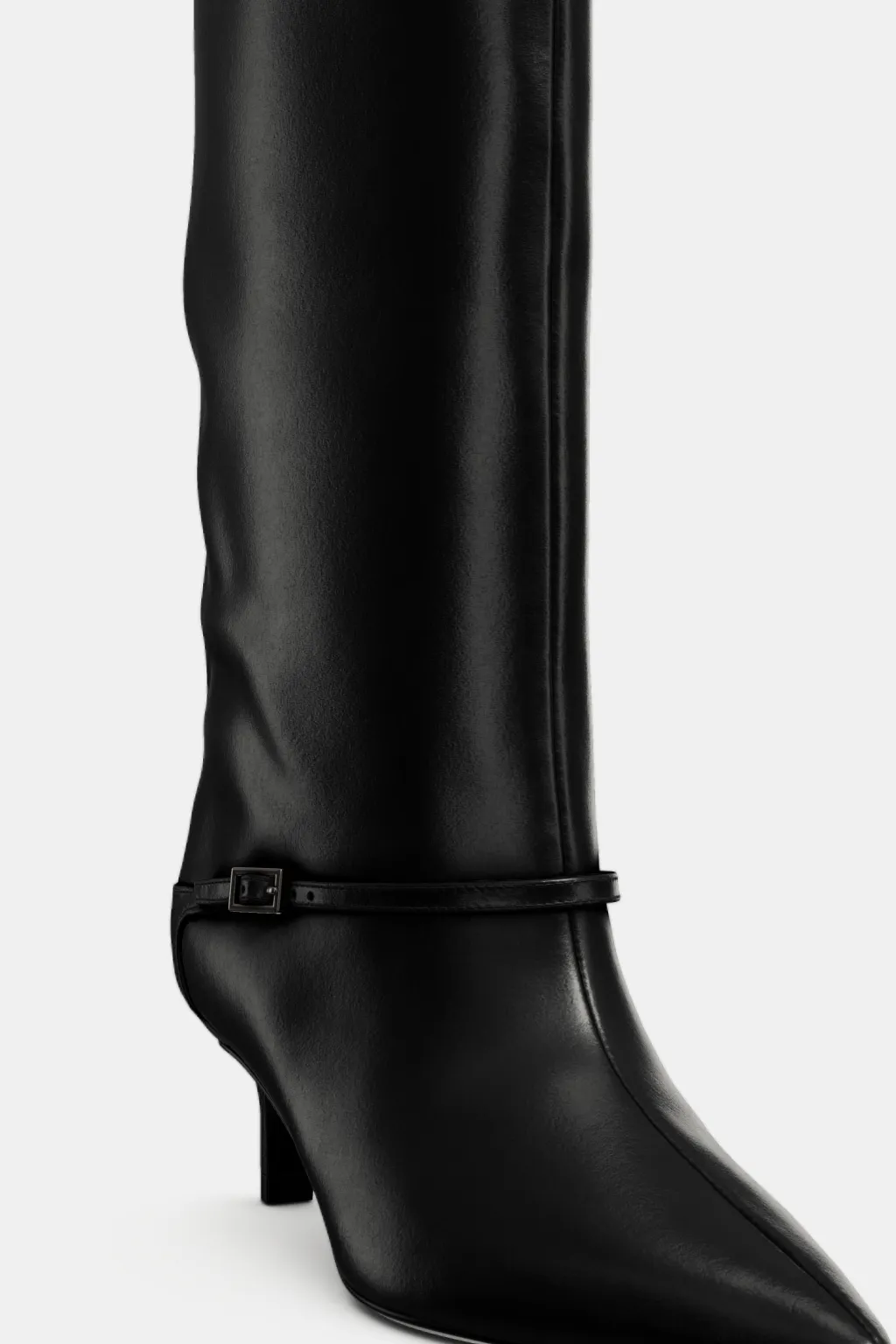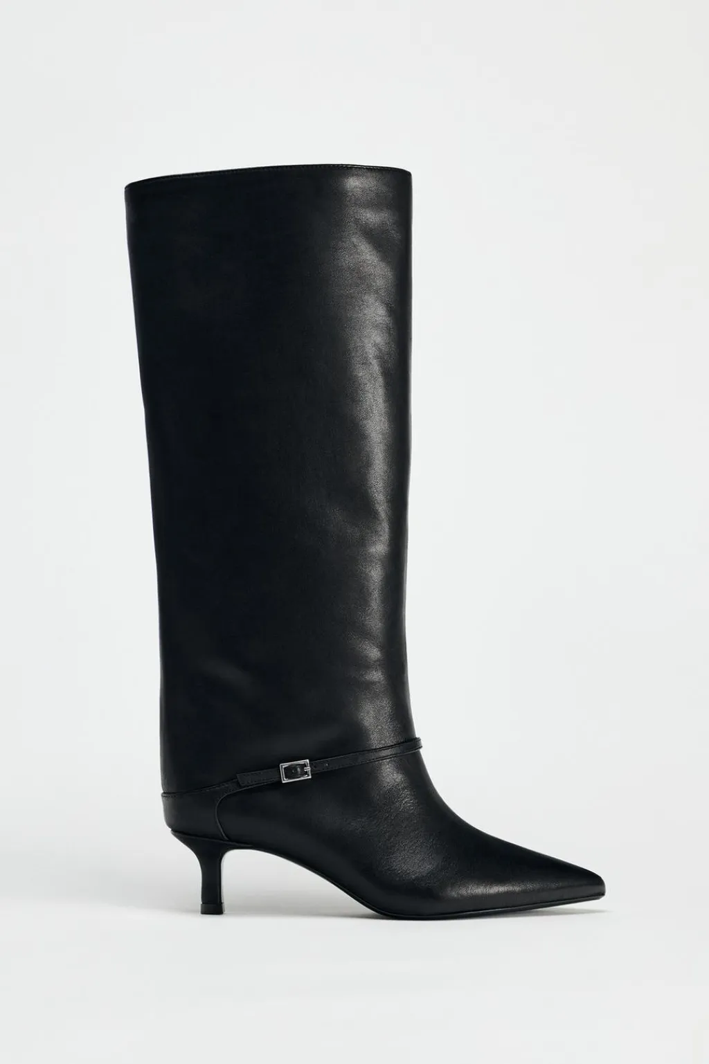 Zapato tipo bota con tacón kitten en piel. Detalle de tira con hebilla en la parte delantera. Pespunte en el corte. Acabado en punta.