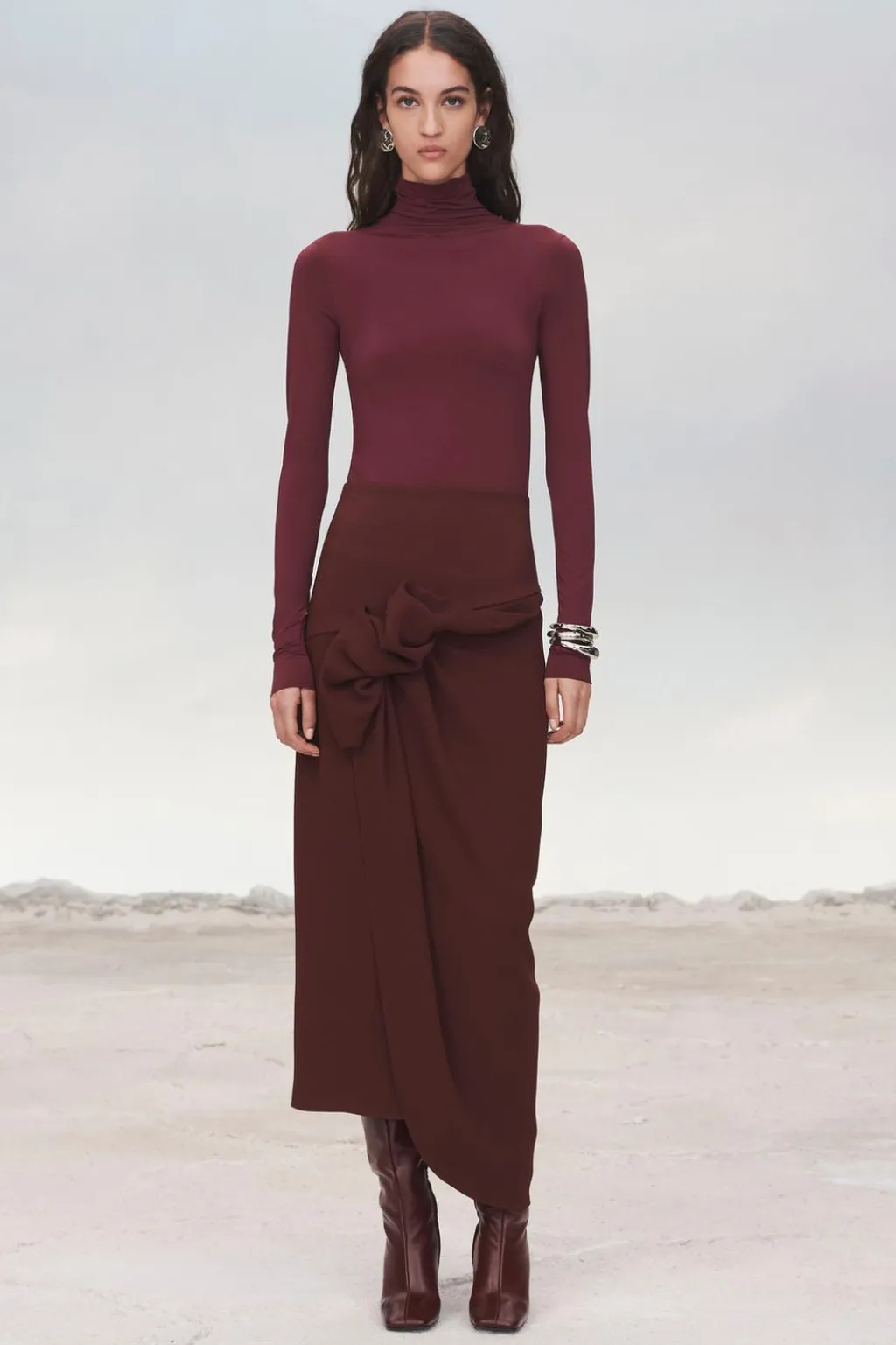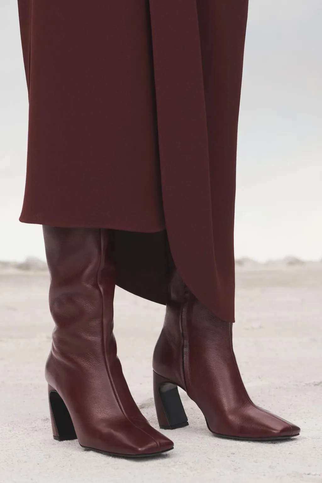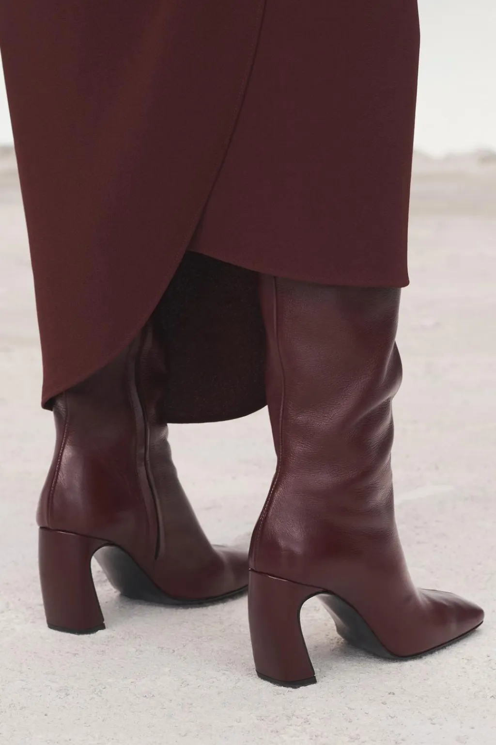 Zapato tipo bota con caña ancha en piel. Tacón ovalado. Cierre mediante cremallera. Acabado en punta cuadrada.